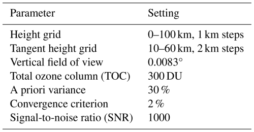 Table 2 shows the relevant input parameters for the retrieval. Note that for the purpose of clarity some of the input parameters that are already listed in Table 1 have also been added here. In addition, the calculated transmission values at 520 nm (Sect. 2.2) for the corresponding latitudes and months were used as data input. The retrieval was restricted to the altitude range of the aerosol extinction coefficients provided (see Sect. 2.1), i.e. from 10 to 27 km. Background aerosol extinction coefficient profiles at 520 nm corresponding to the latitude and month were used as a priori information. These profiles originate from the ECHAM model simulations for 0 Tg S yr−1 (compare Sect. 2.1).