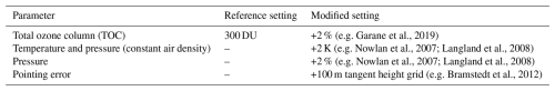 In order to answer the question of whether it is possible to detect the sulfate aerosols formed from relatively small sulfur injections of 1 and 2 Tg S yr−1 with the currently active satellite occultation instruments, an error analysis was carried out. The aim is first to estimate the individual errors in aerosol extinction caused by uncertainties or incorrect knowledge of relevant input parameters, e.g. ozone, pressure, temperature (compare Table 3), so that an overall error estimate can then be made. For this purpose, the total ozone column was increased by 2 % , the temperature by 2 K, and the corresponding pressure was adjusted so that the air density remains constant. Besides this, the pressure was increased by 2 %, and the pointing error was taken into account by shifting the tangent height grid upward by 100 m. The corresponding references are listed in Table 3. In addition, the noise error taken from the noise covariance matrix was included in the error analysis.