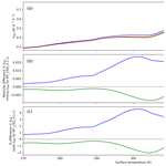 As discussed in Sect. 3.1, the shortwave radiative feedback depends quite strongly on the surface temperature TS because there is more moisture in a warmer atmosphere. In this section, the impact of changing TS on λSW will be presented. As a function of TS, Fig. 2a shows the variation of λSW for all three continuum models considered in this study, whereas Fig. 2b and c show, respectively, the absolute and percentage continuum-induced difference in λSW (with respect to calculations using MT_CKD_4.1.1). Figure 2a shows that λSW increases with TS for all continuum models (from slightly less than 0.300 W m−2 K−1 at 270 K to slightly above 0.750 W m−2 K−1 at 330 K). Because the atmospheric water vapour content increases with temperature, at higher temperatures, the increased atmospheric moisture reduces the upwelling shortwave radiation, leading to an increase in the net shortwave radiation at the top of the atmosphere and hence λSW. This figure shows that the λSW due to the use of the CAVIAR_updated model is not always greater than the λSW estimated using the other models at all surface temperatures, as hinted by calculations at TS = 288 K.