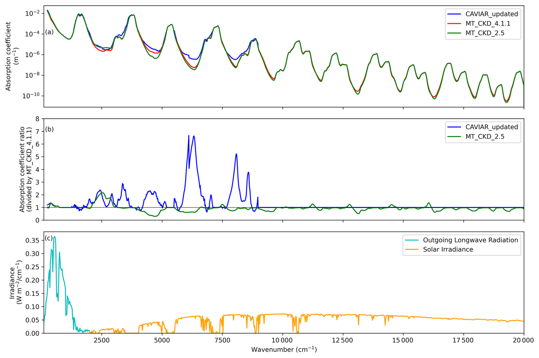 Figure 1(a) Atmospheric absorption coefficients of the CAVIAR (blue), MT_CKD_4.1.1 (red), and MT_CKD_2.5 (green) continuum models from 0 to 20 000 cm−1. (b) Absorption coefficient ratios of the other continuum models and that of the MT_CKD_4.1.1 model. These absorption coefficients are for the 920 m thick atmospheric layer between ∼ 960 and ∼ 860 hPa with temperatures of about 289 and 286 K and water vapour mole fractions of about 0.0137 and 0.0101 and for the median profile of the CKDMIP datasets. The absorption coefficients were calculated by simply dividing layer optical depths of the CKDMIP median profile by the layer thickness of 920 m calculated with the hypsometric equation. (c) Spectral outgoing longwave radiation from the top of the atmosphere (cyan) and spectral solar irradiance at ∼ 960 hPa (orange). These irradiances were calculated for a tropical atmosphere using the Atmospheric Radiative Transfer Simulator (ARTS; Buehler et al., 2018, 2025).