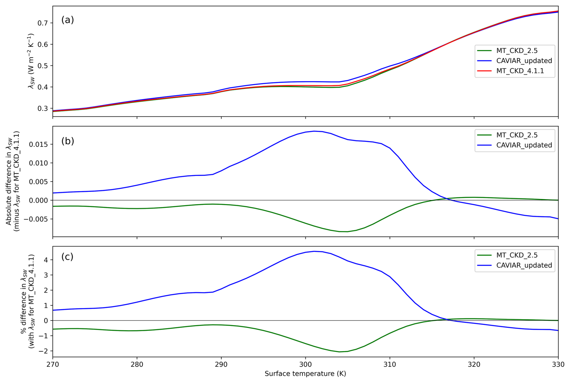 Figure 2As a function of surface temperature (TS), (a) variation of the clear-sky shortwave climate feedback parameter (λSW) estimated using the MT_CKD_2.5 (green), CAVIAR_updated (blue), and chosen reference MT_CKD_4.1.1 (red) continuum models; (b) absolute difference in λSW (with respect to values calculated using the MT_CKD_4.1.1 model); and (c) percent differences in λSW (with respect to calculations using MT_CKD_4.1.1).