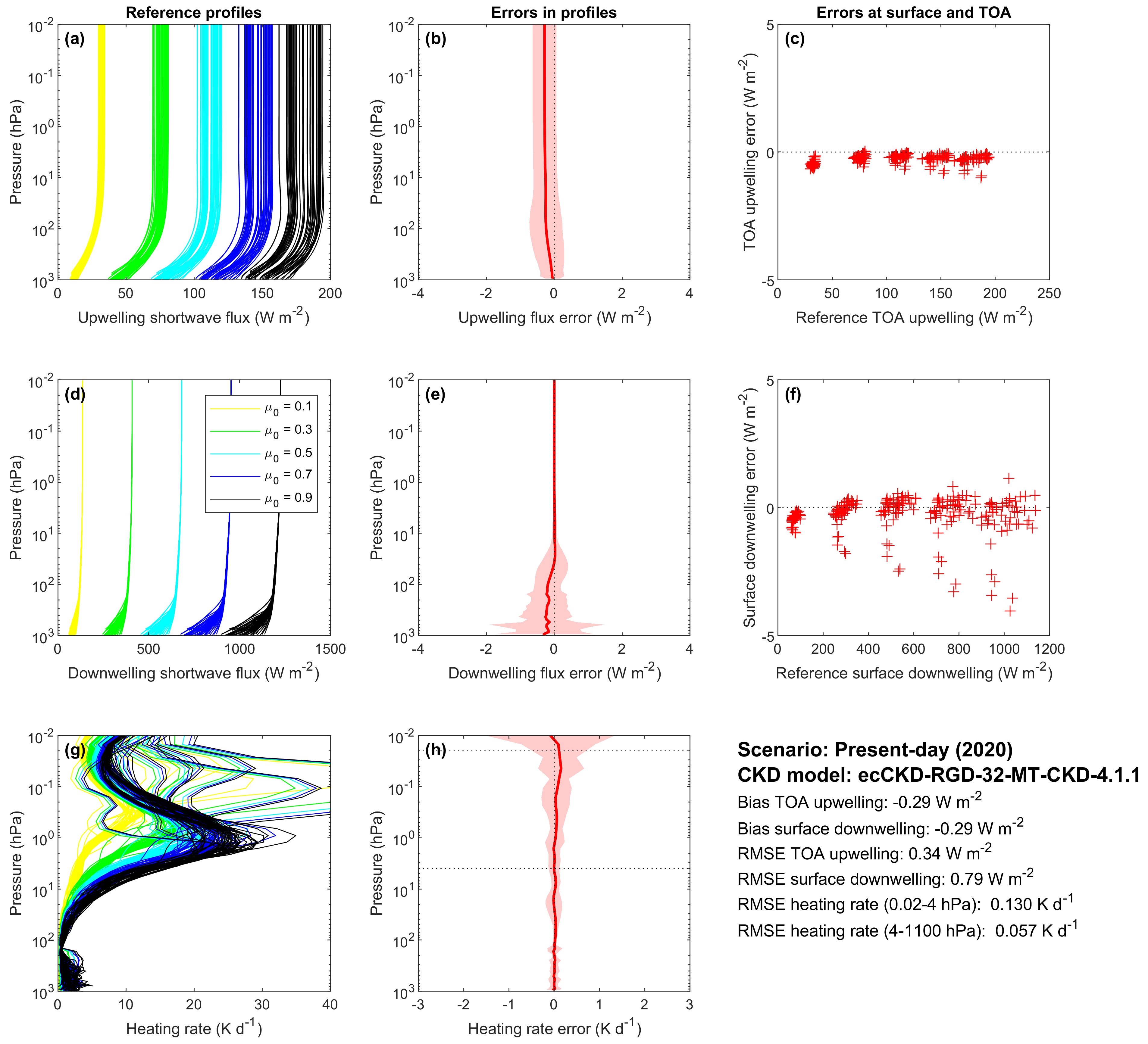 Figure A1An evaluation of clear-sky shortwave fluxes and heating rates from an ecCKD gas-optics table trained with the MT_CKD_4.1.1 continuum model for the 50 independent profiles of the CKDMIP evaluation dataset with present-day concentrations of greenhouse gases. Upwelling fluxes, downwelling fluxes, and heating rates from the reference line-by-line calculations are shown in panels (a), (d), and (g), whereas panels (b), (e), and (h) show the corresponding biases in the calculations using the generated ecCKD gas-optics table. In the panels, 95 % of the errors are within the shaded areas. Panels (c) and (f) depict instantaneous errors in upwelling top-of-atmosphere and downwelling surface fluxes. The statistics of the comparison are summarized in the bottom-right panel. The reference line-by-line calculations in panels (a), (d), and (g) are for all 50 CKDMIP evaluation profiles at five values of the cosine of the solar zenith angle, μ0 (0.1, 0.3, 0.5, 0.7, and 0.9). This gives a total of 250 combinations that are used in the subsequent evaluation.