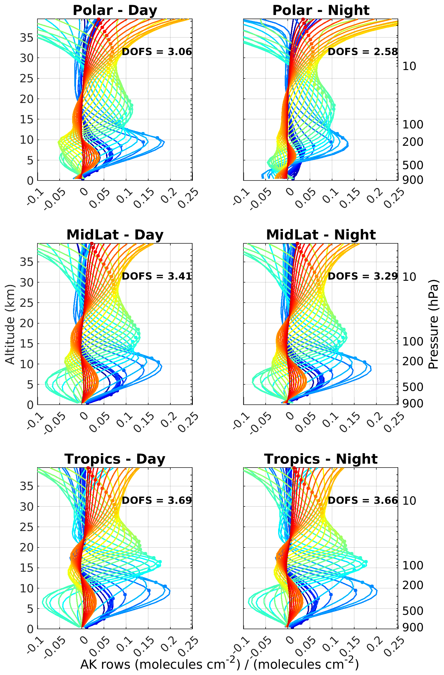 Figure 1 shows the vertical sensitivity of IASI in the polar, midlatitude, and tropical regions, separated into day and night conditions. In all regions, the averaging kernel (AK) values do not reach their maximum at the nominal altitudes, indicating that the ozone retrieval at each level is impacted by contributions from other altitudes. The maximum sensitivity is observed around 8 km, regardless of day or night conditions. For the midlatitude and tropical regions, there are no significant differences between day and night sensitivity. However, at high latitudes, the sensitivity in the lower troposphere is notably weaker at night, as shown by both the averaging kernel curves and the DOFS values (DOFS of ∼ 3 during the day and ∼ 2.5 at night). The tropical regions, benefiting from higher temperatures, show the highest sensitivity, with DOFS values of ∼ 3.7.