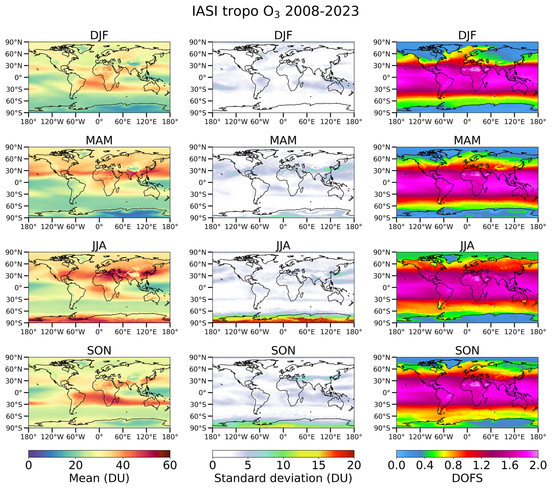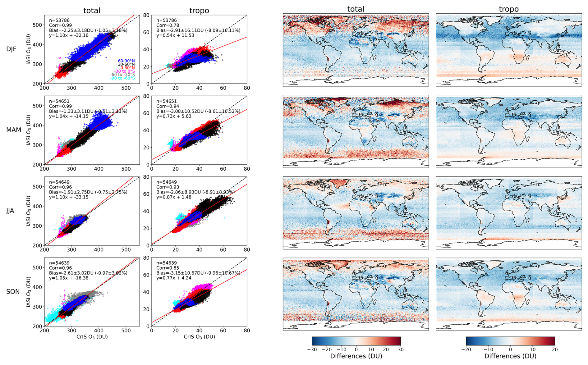 Seasonal comparisons between IASI-CDR and CrIS-TROPESS products are conducted to evaluate their performance for two ozone columns over the period 2016–2022: total and tropospheric. The analysis includes scatterplots and spatial distribution maps, highlighting both the agreements and discrepancies between the datasets as illustrated in Fig. 9. Seasonal periods are defined as DJF (December–January–February), MAM (March–April–May), JJA (June–July–August), and SON (September–October–November).