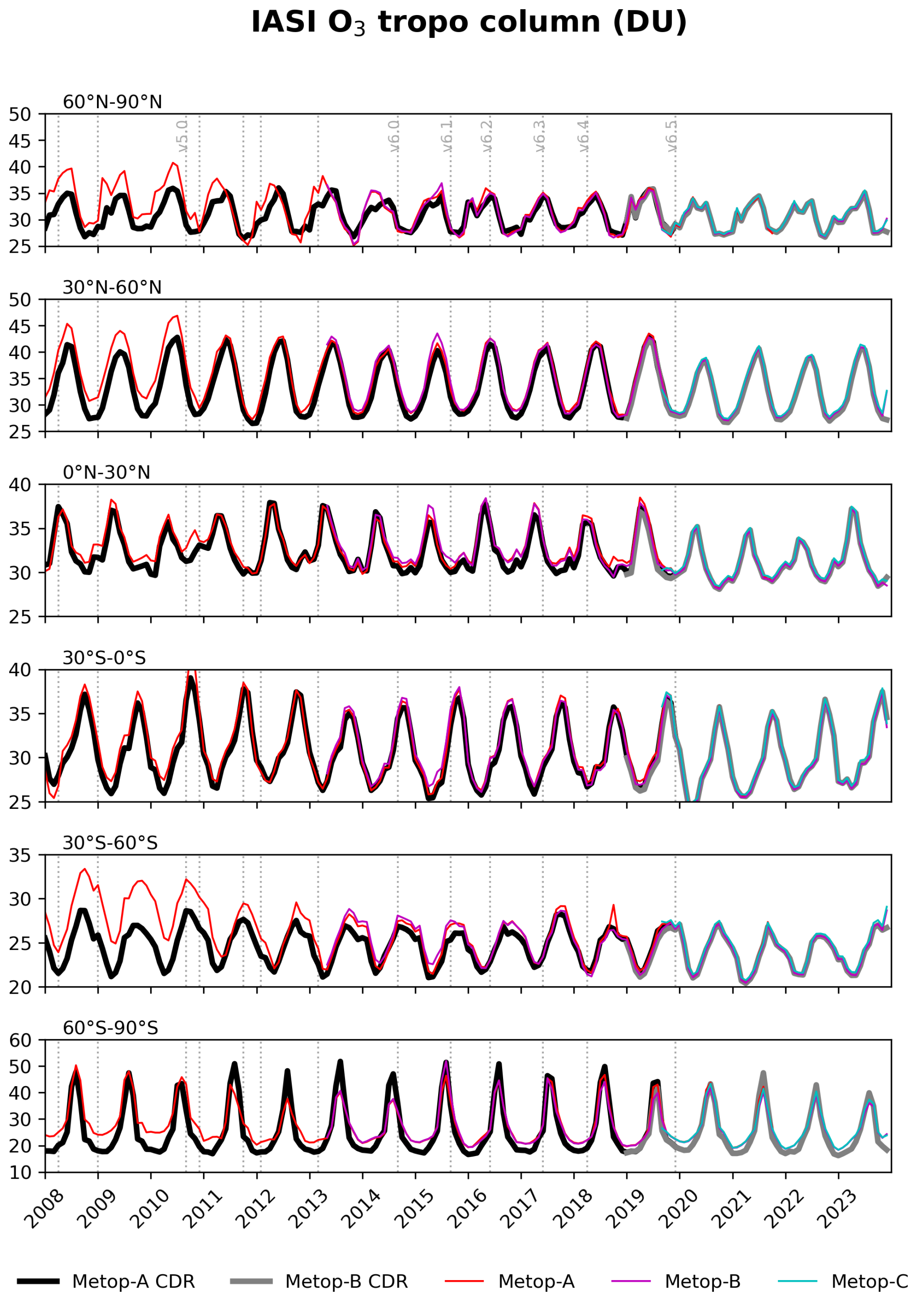 Figures 3 and 5 compare the monthly total and tropospheric ozone time series, respectively, between the three IASI instruments with both IASI-CDR and IASI-FORLI products. A strong consistency is found among the three IASI instruments, with a global bias of less than 0.05 % for the total column and less than 1 % for the tropospheric column. This consistency is observed between IASI-B and -C from 2020 to 2023, and between IASI-A and -B for 2019, as these are the only overlapping periods for these instrument pairs in the IASI-CDR product. For the total column (see Fig. 3), there is a strong agreement between IASI-CDR and IASI-FORLI for Metop-A and -B, which suggests that the total column product is not impacted by the different changes in Eumetsat L2 PPF. However, for the tropospheric column (see Fig. 5), large differences between the two products are observed until end of 2010, corresponding to a change in the Eumetsat Level 2 PPF version. These discrepancies in the tropospheric column before 2010 are likely due to uncertainties in the tropopause height, as the IASI-FORLI product used an earlier version of the temperature profiles to determine the thermal tropopause, in contrast to the more recent version used by IASI-CDR. This is further supported by the fact that we do not observe the same pattern in the differences for the total column product, suggesting that the variations in the tropospheric column are linked to the differing temperature profiles used by the two products. After this period, agreement improves notably across all latitude bands although discrepancies remain visible especially in the high latitudes and southern midlatitudes. Our analysis of the monthly ozone time series shows that IASI-CDR and IASI-FORLI converge starting from late 2019, as expected, since the same version of Eumetsat L2 PPF was used for both products.