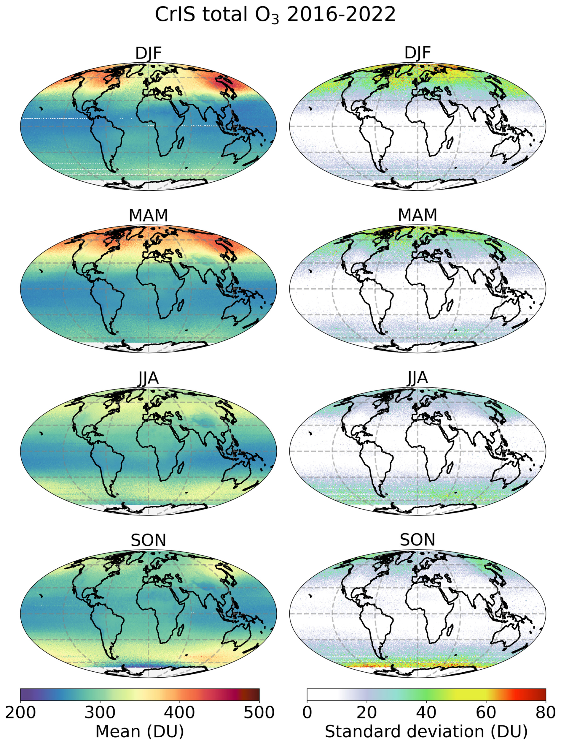 Figure 6Spatial and seasonal distribution of total ozone column derived from CrIS data over the period 2016–2022 in Dobson units (DU): mean (left) and standard deviation (right). DJF, MAM, JJA and SON represent December–January–February, March–April–May, June–July–August and September–October–November, respectively. The data are averaged onto a global 1°×1° grid.