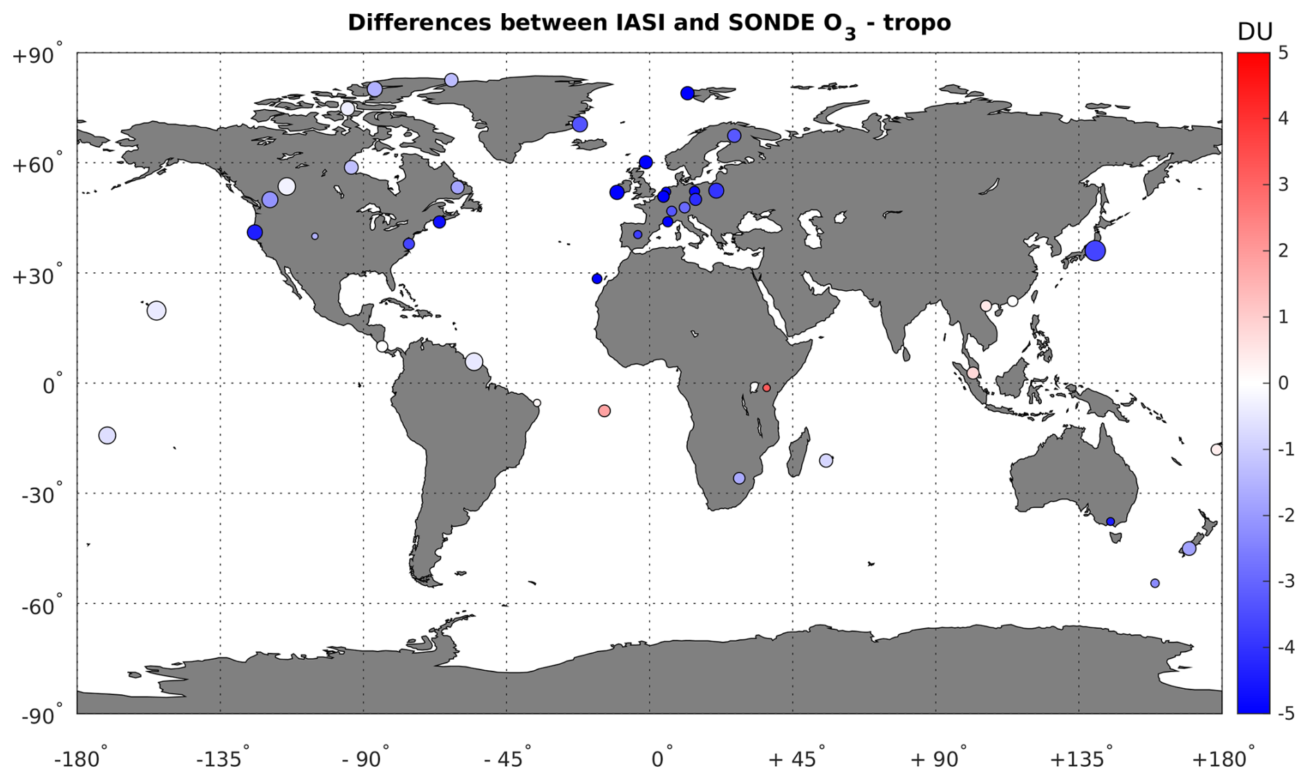 For each sonde measurement, we compute the tropospheric column by using all IASI and smoothed sonde profiles that meet the coincidence criteria. Then, the IASI and smoothed sonde subcolumns are averaged, yielding one IASI-SONDE profile pair corresponding to each sonde measurement. Both IASI O3 vertical profiles and tropospheric columns are compared against ozonesonde data. The differences are determined as: [IASI − SONDE] (in DU) or [100× (IASI − SONDE)/SONDE] (in %), where SONDE serves as a reference for the comparison. We also assess the four subcolumns defined in Boynard et al. (2018), each containing approximately one piece of information and showing maximum sensitivity around the middle of each layer. The subcolumns correspond to the following layers: surface – 300, 300–150, 150–25 and 25–3 hPa. The results are presented in Appendix A.