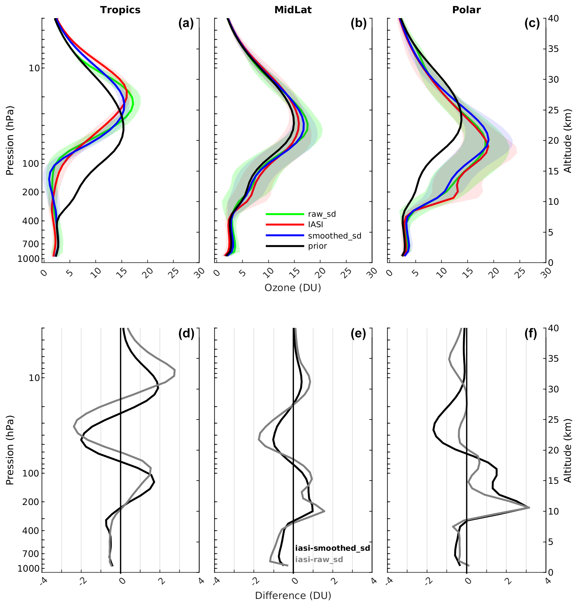 Figure 10(a, b, c) Mean ozone vertical profiles in Dobson units (DU) retrieved by IASI (red), measured by the sondes (green), and measured by the sondes after applying the IASI averaging kernels (blue) for three latitude bands: tropics (30° S–30° N), midlatitudes (30–60° North and South) and polar regions (60–90° North and South). Shaded areas indicate the standard deviation around each mean ozone vertical profile. The black line indicates the a priori ozone profile used in the IASI retrievals; (d, e, f) vertical distribution of the differences in DU between the IASI retrieved mean profile and the smoothed sonde mean profile (black), as well as between the IASI retrieved mean profile and the raw sonde mean profile (gray).