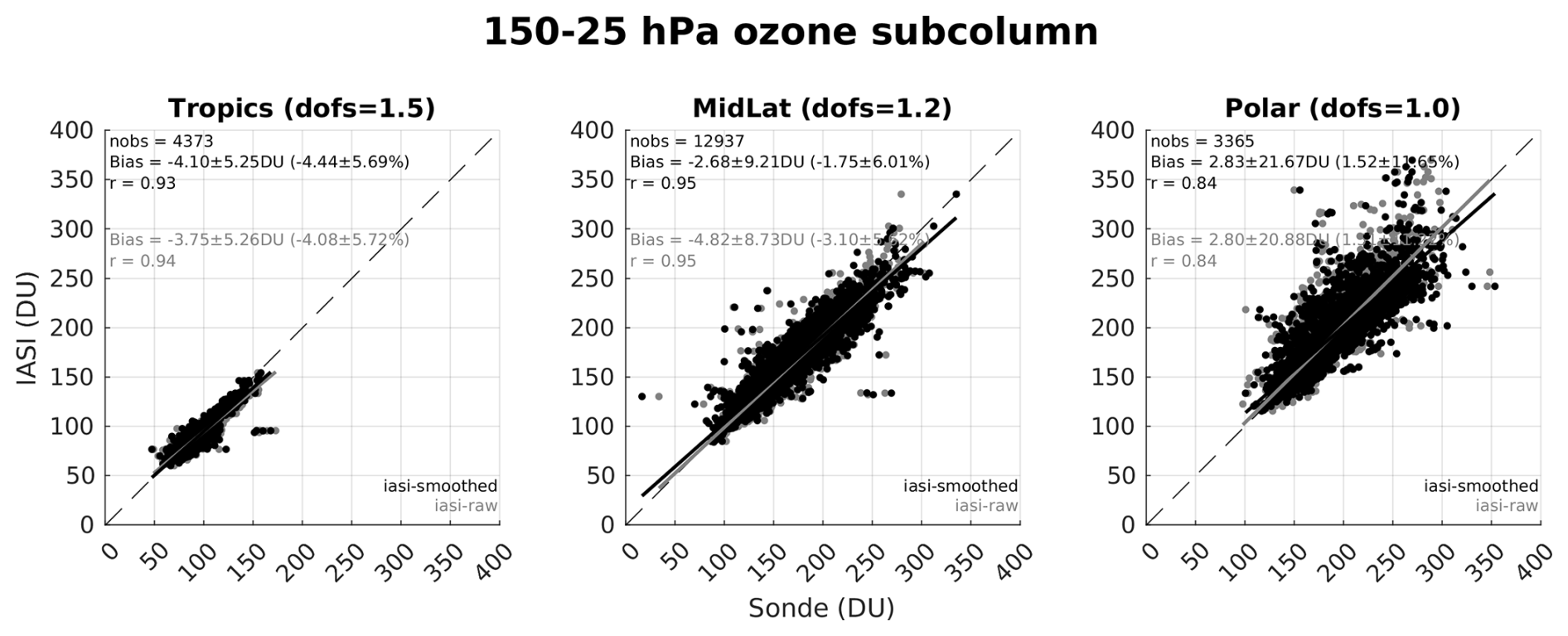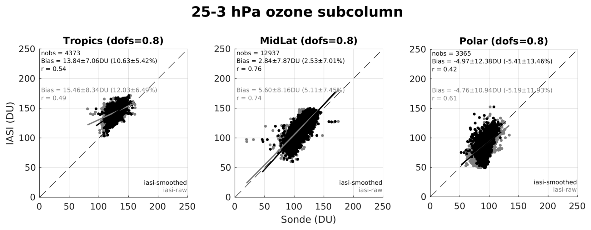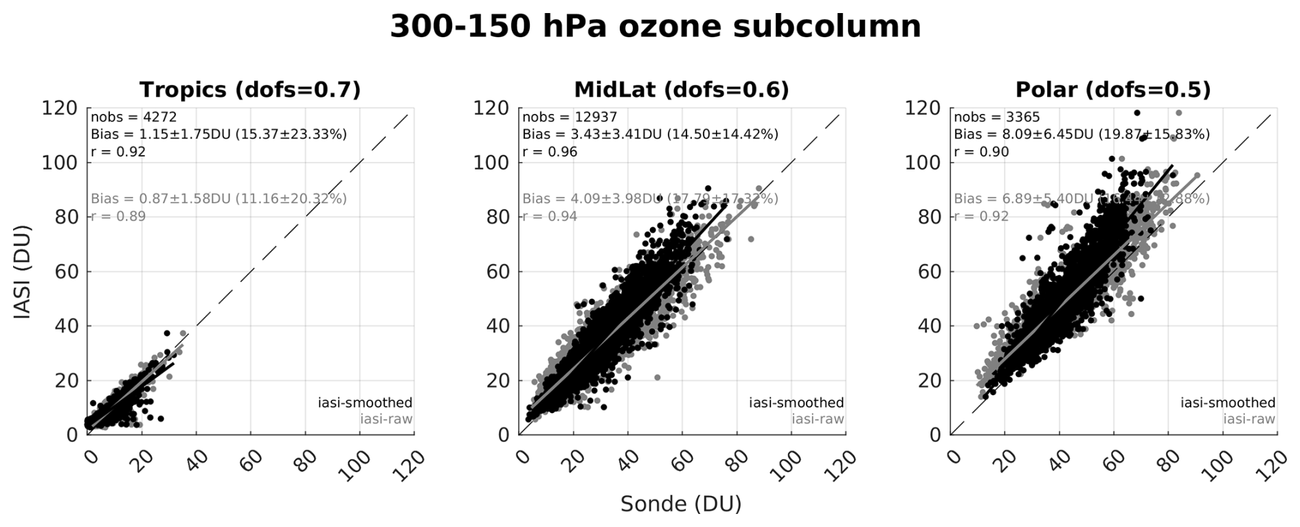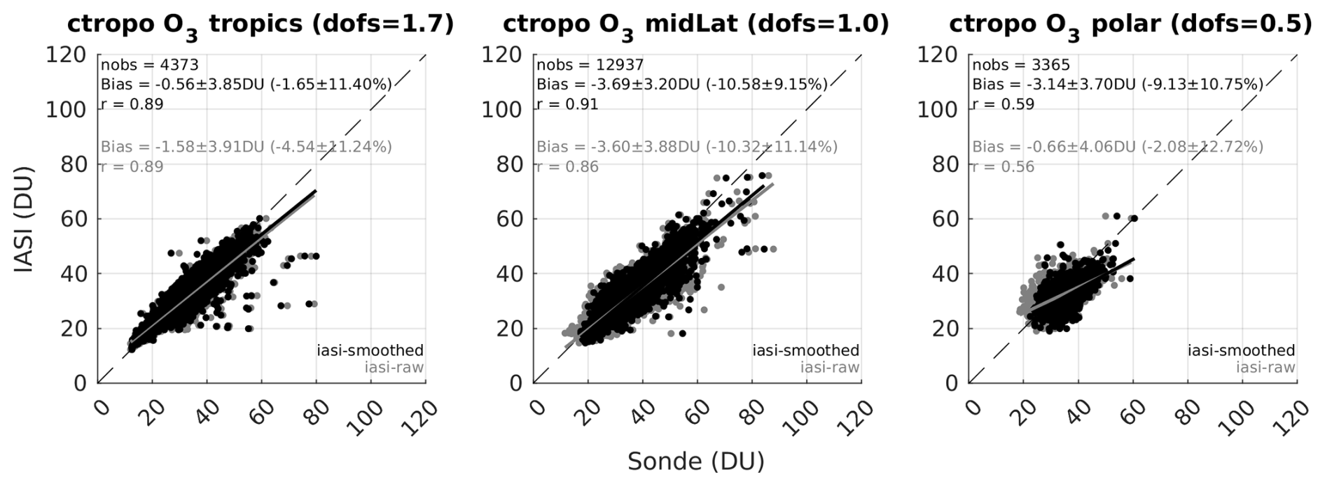 Figure 11, illustrating the scatterplots between IASI and smoothed sonde data, shows that IASI underestimates the tropospheric ozone column, with biases ranging from −2 % in the tropics to −10 % in the midlatitudes and polar regions (see Fig. 8 for the spatial distribution of the bias). The standard deviation is about 11 % across all latitude bands, indicating a consistent level of variability in the measurements. The correlation coefficient is high (0.9) in both the tropics and the midlatitudes, suggesting strong agreement between IASI and sonde concentrations, but drops to 0.6 in the high latitudes, indicating weaker performance in the polar regions, which is due to limited signal in those regions (DOFS =0.5). The DOFS are 1.7 in the tropics and 1 in the midlatitudes, reflecting better retrieval of information in those regions. The number of observations is 2–3 times higher in the midlatitudes compared to the tropics and the high latitudes, which could contribute to the more robust results in those regions. The comparison between IASI and raw sonde data also included in Fig. 11 shows similar results to the comparison with smoothed sonde data, although it exhibits a larger bias in the tropics and a lower bias in the polar regions. The higher bias observed with smoothing in the polar regions may be due to the loss of important temperature and humidity variability, while the lower bias in the tropics could result from the more stable atmospheric conditions, which are better captured by smoothing.