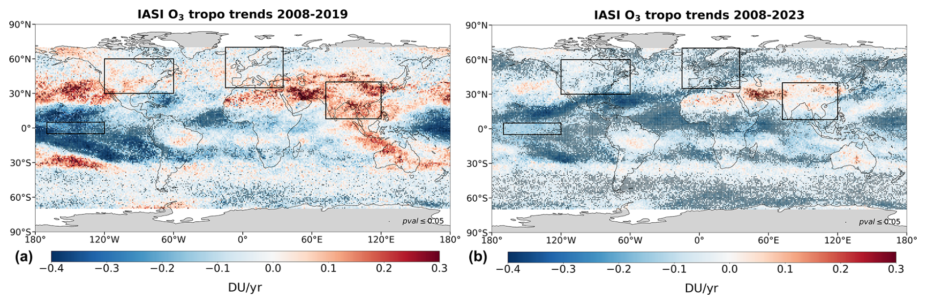 Our primary trend analysis is based on the 2008–2023 period, which offers a sufficiently long time series (16 years) for robust detection of tropospheric ozone changes from both satellite and ozonesonde data. To complement this, we also compute trends over the shorter 2008–2019 window, which is used specifically as a pre-COVID reference period. This secondary time frame allows us to assess the potential influence of the COVID-19 pandemic on tropospheric ozone, but is not intended to serve as a baseline for long-term climatological trend interpretation.