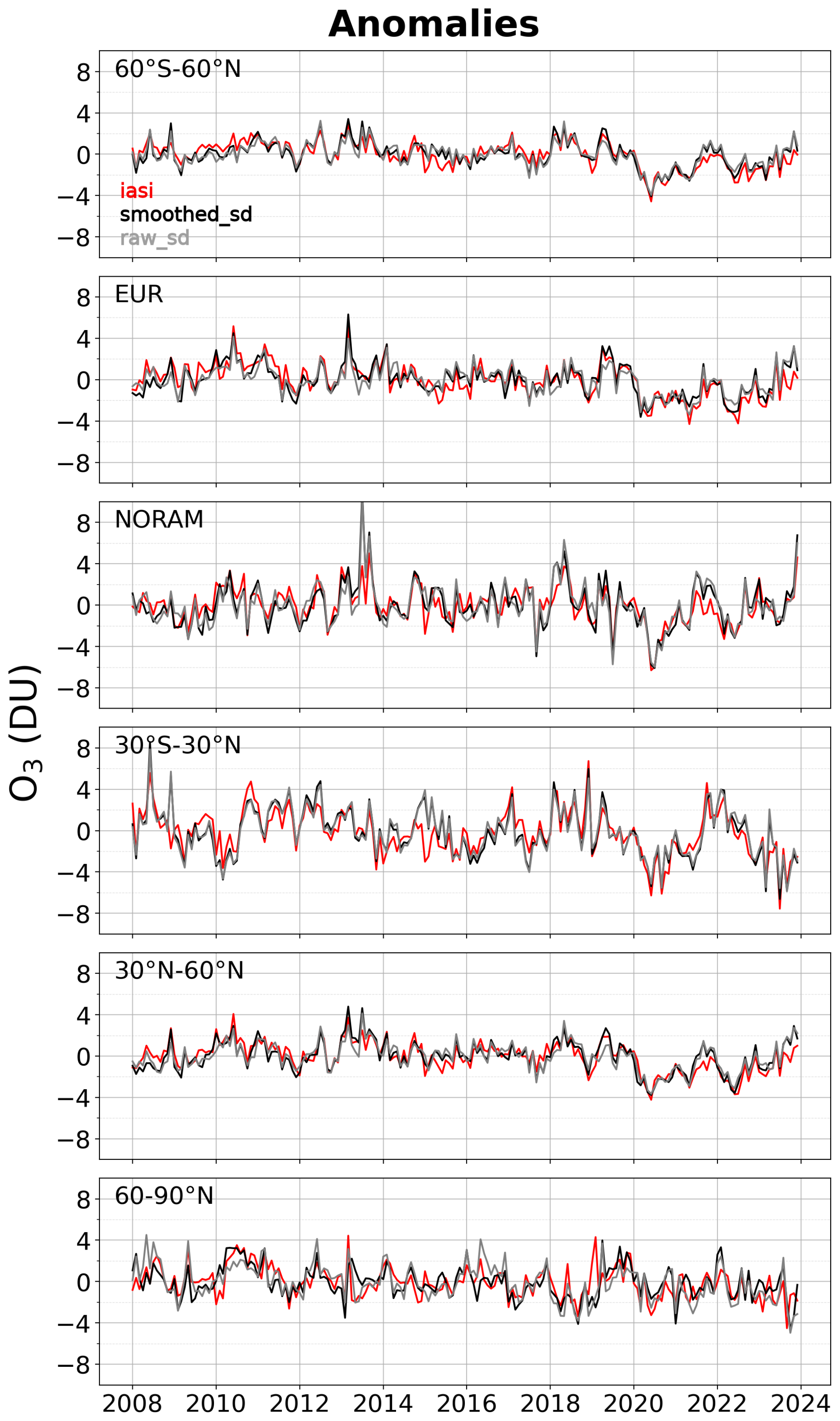 Figure 10 (bottom panels) illustrates the differences in ozone concentration (in Dobson units, DU) between the IASI retrieved and sonde profiles, both raw and smoothed. IASI shows lower O3 values in the troposphere and middle stratosphere, while overestimating O3 in the upper troposphere and lower stratosphere (UTLS) throughout all latitude regions. Potential factors contributing to the increased bias in the UTLS include the limited vertical resolution of IASI, spectroscopic uncertainties related to ozone absorption lines, or the use of inadequate a priori information (Boynard et al., 2016). Specifically, the effect of using a priori constraints that change with latitude still needs to be explored further. In the tropics, smoothing the sonde data reduces differences compared to the raw data, particularly in the stratosphere, and introduces a vertical shift of a few kilometers downward. However, in the UTLS, the differences remain unchanged. At midlatitudes, the differences between IASI and sonde profiles are generally smaller than those observed in the tropics. Additionally, the differences are less pronounced when comparing IASI data to the smoothed sonde profiles, suggesting that smoothing helps to reduce some of the variability and improve agreement with IASI data in this region. In the polar regions, differences between IASI and sonde profiles begin to diverge above 200 hPa, with larger discrepancies between IASI and the smoothed sonde than the raw sonde. This results from IASI limited vertical sensitivity, which is further reduced in cold conditions due to weaker radiance signals, increasing reliance on the a priori. Applying the averaging kernel (AK) smooths the sonde to IASI resolution but also incorporates a priori biases, especially where retrievals are poorly constrained, such as above the tropopause. In contrast, in midlatitudes and the tropics, differences between IASI and the raw sonde are generally larger. In the tropics, the IASI–raw sonde difference profile shifts upward relative to the smoothed sonde difference, likely reflecting the AK smoothing and a less representative a priori. The figure highlights regional variations in the alignment between IASI and sonde data, emphasizing the impact of smoothing on data comparison. These differences underscore the importance of a priori assumptions in the retrieval process, especially in the tropics, where low ozone variability and unique atmospheric conditions make the retrieval particularly sensitive to these assumptions. Further refinement of a priori constraints is necessary in the tropics to reduce biases, and smoothing is essential in improving agreement between IASI and sonde data, particularly in regions with more variable ozone profiles, such as the midlatitudes.