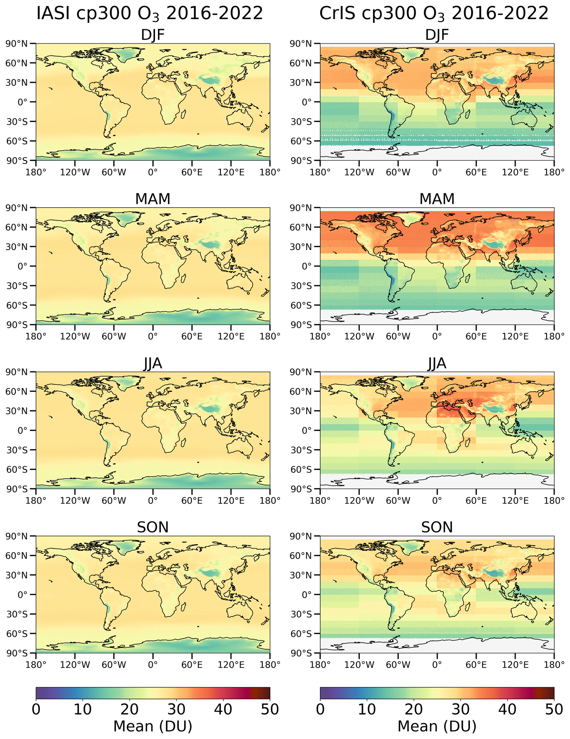 In this study we analyze the TROPESS-CrIS O3 product over the period from January 2016 till December 2022. The data are averaged daily on a global grid with a resolution of 1°×1°. Figures 6 and 7 illustrate the spatial and seasonal distribution of CrIS O3 total and tropospheric column, respectively, over the period 2016–2022. The spatial and season patterns between IASI and CrIS data are in very good agreement for both columns. A detailed comparison of these datasets is conducted in Sect. 3.