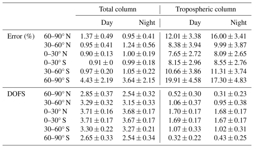 The variability in data sensitivity and quality is reflected in both the error and DOFS analyses, revealing differences across latitude bands and between day and night (see Table 1). In high latitude regions (60–90° N and 60–90° S), total column errors are significantly higher, particularly in the Southern Hemisphere (SH), where daytime errors reach 4.43 % compared to 3.64 % at night. Similarly, in the NH, daytime errors (∼ 1.37 %) are higher than nighttime errors (∼ 0.95 %). Tropospheric column errors are even more pronounced in these regions, especially in the SH, where daytime errors peak at ∼ 19.91 %. These results highlight reduced data quality and sensitivity in polar regions, particularly at night, due to lower surface temperatures and weaker signals. In the midlatitudes (30–60° N and 30–60° S), total column errors are relatively low and consistent between day and night, ranging from ∼ 0.95 % to ∼ 1.24 %. In the tropics (0–30° N and 0–30° S), total column errors are even lower, ranging from ∼ 0.90 % to ∼ 1.00 %. Tropospheric column errors in these regions are similarly low, with slightly higher values in the SH midlatitudes, suggesting generally higher data quality. Tropical regions benefit from more favorable atmospheric conditions and higher temperatures, which contribute to significantly better data quality compared to the polar regions.