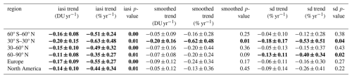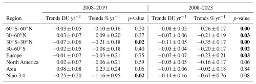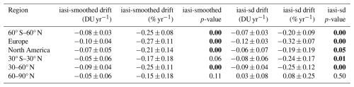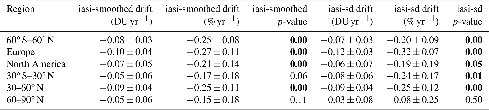 Table 3Tropospheric ozone drifts derived from IASI and ozonesonde data (smoothed and raw) over 2008–2023 on both global and regional scales. The thermal tropopause is estimated using the World Meteorological Organization thermal definition (WMO, 1957). Uncertainties are reported at the 2σ level. P-values ≤0.05 are shown in bold.