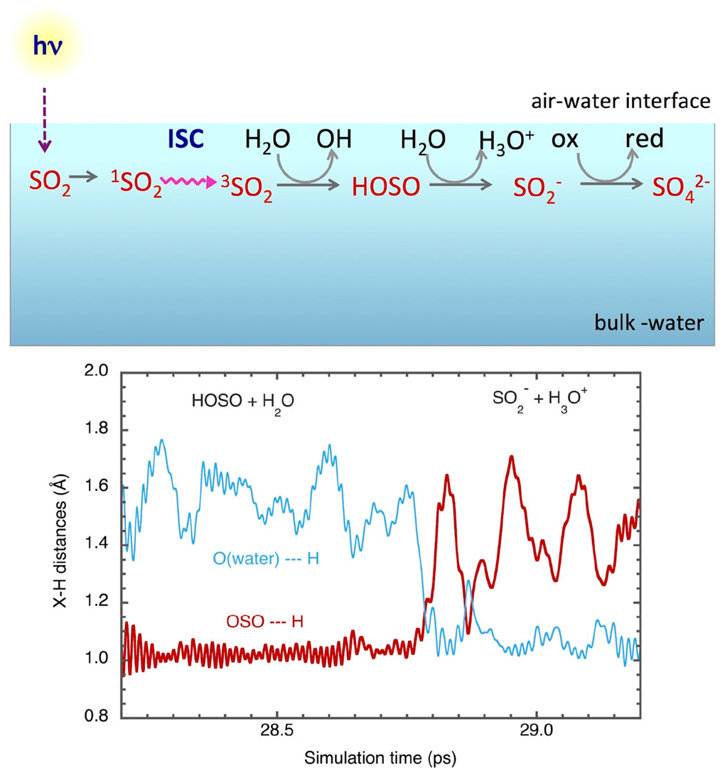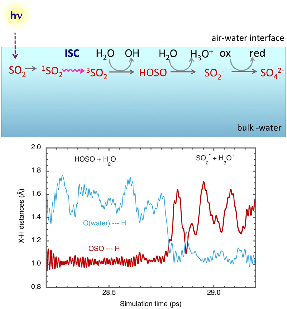 In recent years, Francisco's research group (Anglada et al., 2014, 2020a; Martins-Costa et al., 2019, 2018, 2012b) has used quantum mechanics/molecular mechanics molecular dynamics (QM/MM-MD) simulations to propose that many important atmospheric species such as O3, H2O2, methylhydroperoxide, nitrogen dioxide (NO2), and HO2 radicals exhibit specific behaviors at the air–water interface, accelerating photodissociation rates, which may consequently impact the physicochemical characteristics of aerosols and the atmospheric environment. These species tend to accumulate at the air–water interface, leading to an increase in interface concentration, thus influencing interfacial chemical processes (Anglada et al., 2020b; Martins-Costa et al., 2012b). Simulation studies have found that the absorption band of O3 accumulated at the air–water interface undergoes a red shift and broadening compared to that in the gas phase, leading to an order of magnitude faster photodissociation rate of O3 at the interface than in the gas phase, resulting in a 4-order-of-magnitude increase in the rate of OH radical generation at the interface (Anglada et al., 2014). Additionally, methylhydroperoxide in the air–water interface exhibits a blue shift and broadening in its UV-visible absorption spectrum, which is attributed to hydrogen bonding between methylhydroperoxide and water molecules (Martins-Costa et al., 2017). Similarly, NO2 also exhibits accumulation behavior at the air–water interface, with broadening of its absorption band, leading to an increase in its photodissociation rate at the interface (Murdachaew et al., 2013; Martins-Costa et al., 2019). Intriguingly, the excited triplet state of SO2 () produced under sunlight irradiation can react with water molecules, leading to the formation of OH radicals and hydroxysulfinyl radical (HOSO), which is further converted to and then by the oxidation–reduction process to sulfate () (Fig. 1) (Ruiz-López et al., 2019).