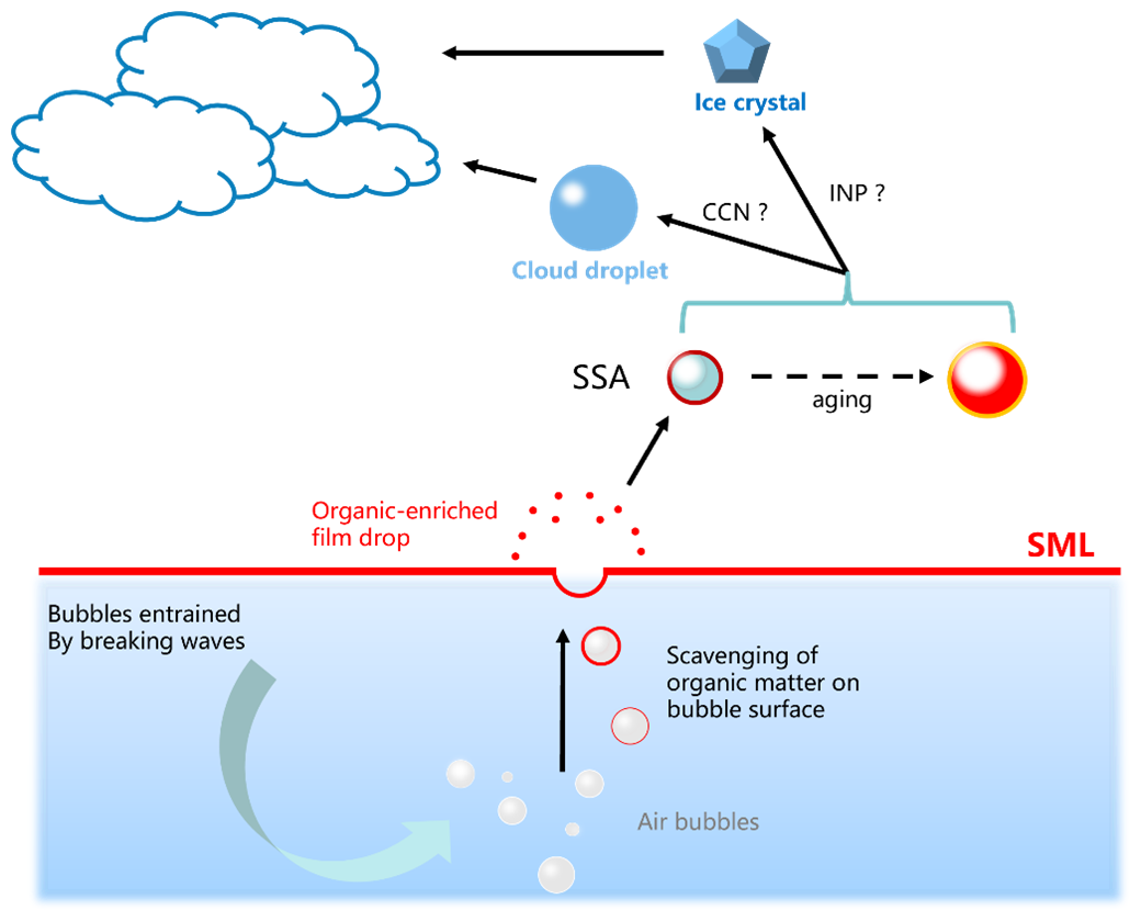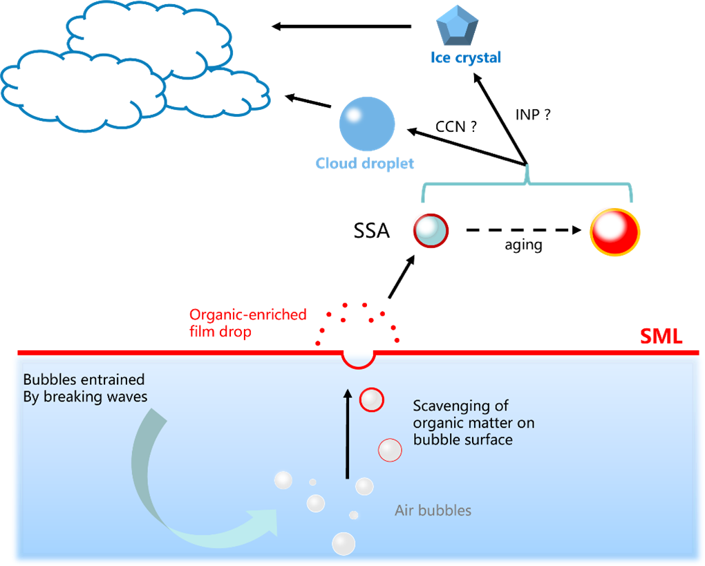 Figure 2Illustration of the role of SML in regulating SSA production and properties which could further affect its ice-nucleating and cloud condensation potentials and eventually cloud formation.
