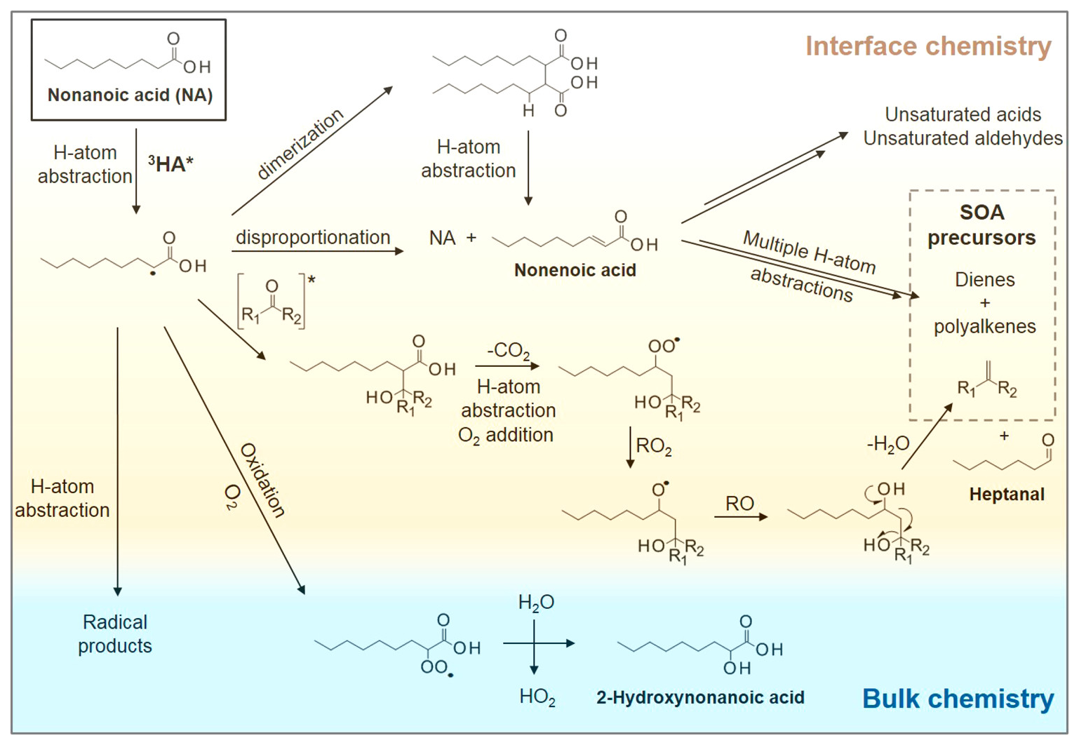 Figure 3Reaction pathways of nonanoic acid at the air–water interface and in the bulk water. Reproduced with permission from Bernard et al. (2016).
