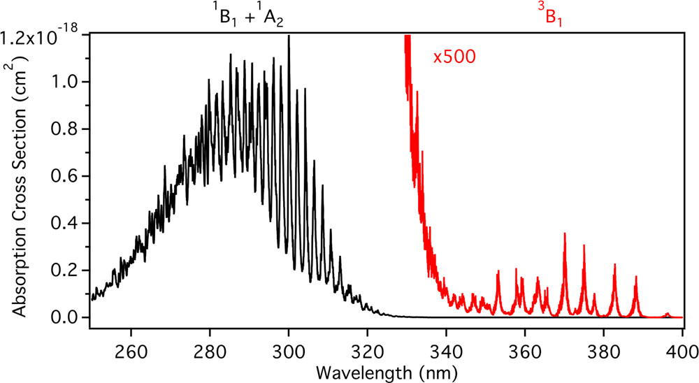 Figure 6Spectrum of SO2 showing the mixed 1B1 and 1A2 state from 250–340 nm and the forbidden 3B1 state from 240–400 nm. Reprinted with permission from Kroll et al. (2018b). Copyright (2018) American Chemical Society.