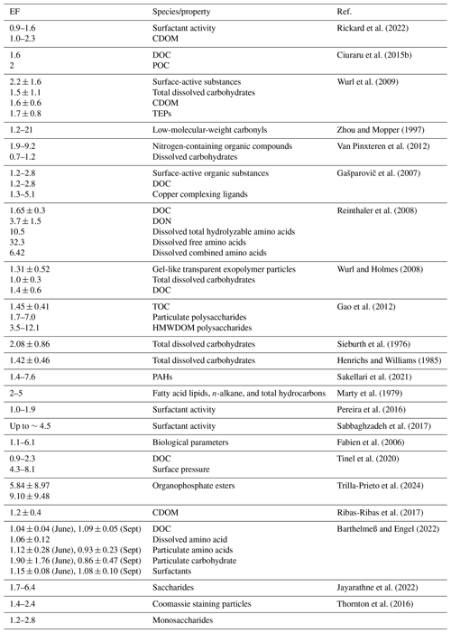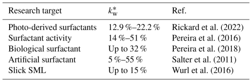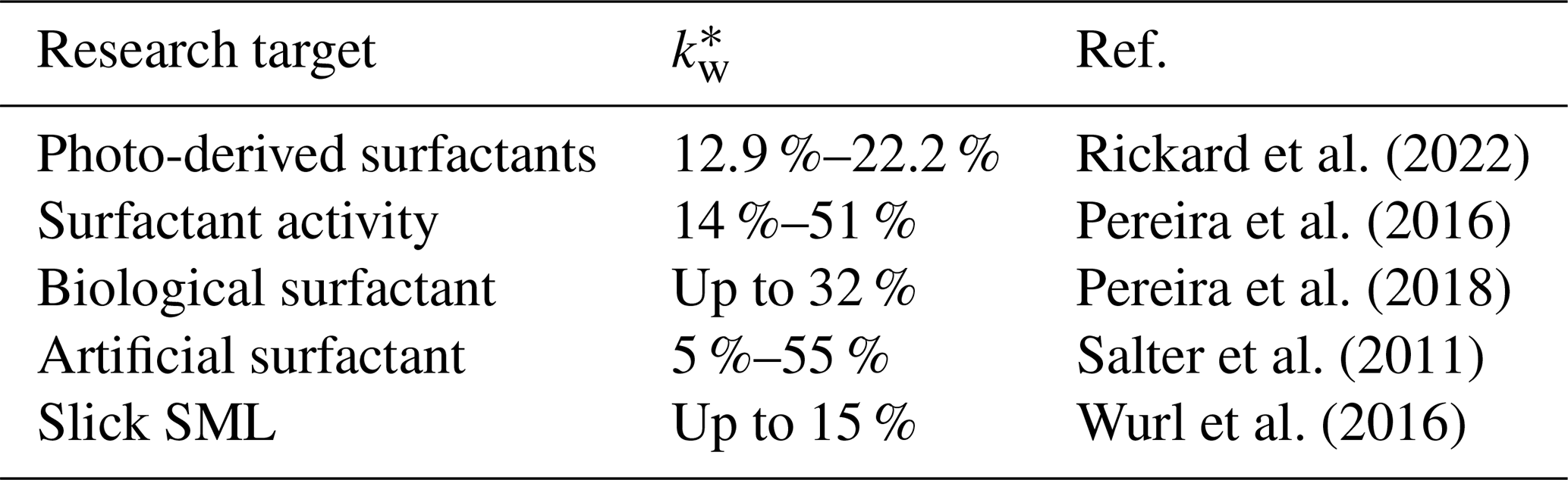 Early research on the SML primarily focused on the physical barrier effect of surfactants, suggesting that the organic film composed of surfactants would simultaneously hinder the evaporation of seawater and the transfer of atmospheric gases to the ocean (Liss and Duce, 1997; Donaldson, 2006; Rudich, 2003). Surfactants in the SML are divided into water-soluble and water-insoluble categories, among which water-soluble surfactants (such as TEPs, lipids, polysaccharides, amino acids) play a significant role in inhibiting the gas transfer rate between the ocean and the atmosphere (Bock et al., 1999; Frew et al., 1990). For instance, Tsai and Liu (2003) estimated a reduction of 20 %–50 % of the global annual net flux of CO2 by correlating surfactant abundance and distribution with local primary productivity, assuming surfactant enrichment increases alongside productivity (Tsai and Liu, 2003). However, field measurements by Wurl et al. (2011) contradicted this assumption, demonstrating that surfactant enrichment decreases with primary productivity. Their study also generated the first global maps of surfactant concentrations in the SML and their EFs by integrating experimental data on primary productivity and wind speed. These findings underscored the SML's potential global influence on air–sea gas exchange and biogeochemical cycles (Wurl et al., 2011). A more recent study by Sabbaghzadeh et al. (2017) argued that SA enrichment in the SML should be essentially decoupled from ambient wind speed. Instead, SA enrichment is more related to the SA in subsurface water (Sabbaghzadeh et al., 2017; Pereira et al., 2016). Additionally, while chlorophyll α is widely used as a proxy for primary productivity (Pereira et al., 2016), field studies have shown it to be an unreliable indicator for parameterizing the inhibitory effect of surfactants in the SML (Sabbaghzadeh et al., 2017). Table 2 summarizes the impact of surfactants on the transfer rates of CO2 at the air–water interface.