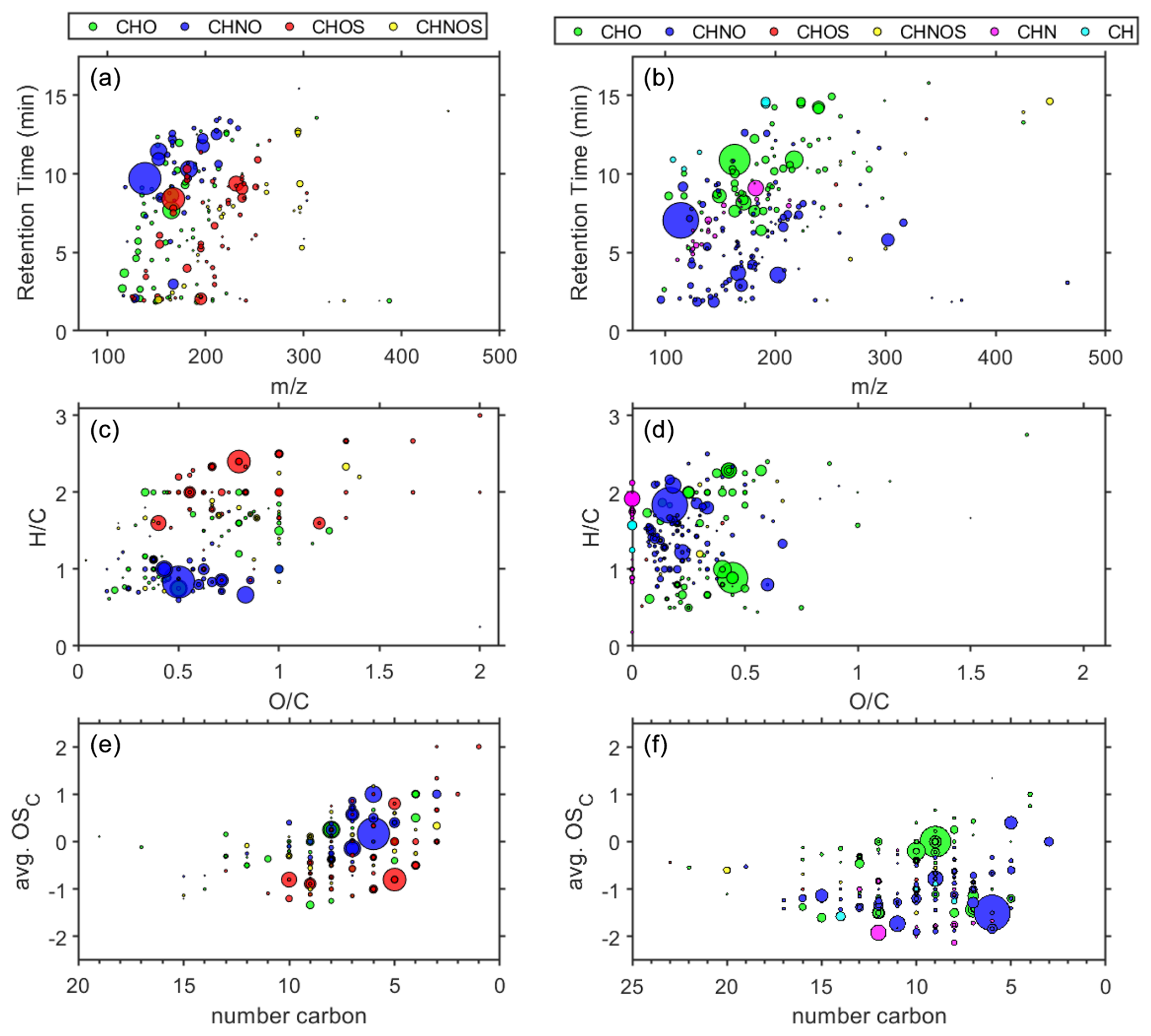 Figure 1(a) Scatterplot of HPLC retention time (min) vs. ratio; (b) van Krevelen diagram of ratio vs. ratio; (c) Kroll diagram of number of C atoms against the average oxidation state of C. Panels (a), (c), and (e) are for negative ionization mode or (−)HESI, while panels (b), (d), and (f) are for positive ionization mode or (+)HESI. The area of the marker indicates relative intensity in the reserved extract, while color denotes the compositional class of the assigned compound: green for CHO, blue for CHNO, red for CHOS, yellow for CHNOS, magenta for CHN, and cyan for CH.