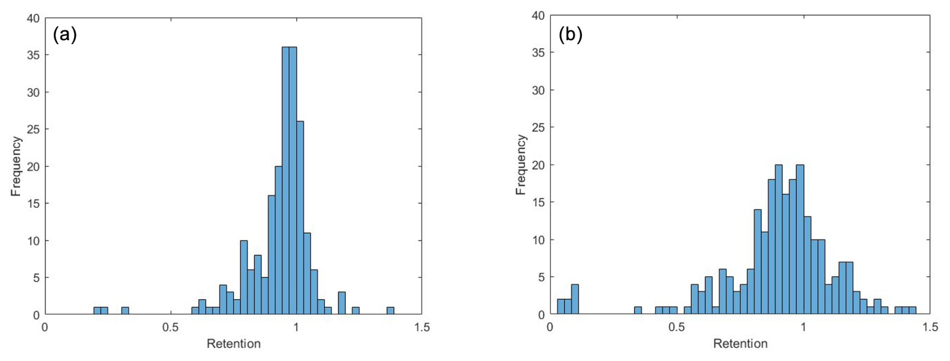 Figure 2Histograms of retention coefficients for all measured L5 and above compounds that met peak quality constraints. (a) (−)HESI. (b) (+)HESI.