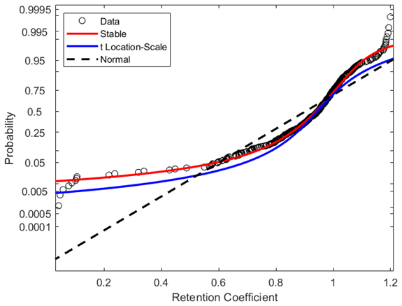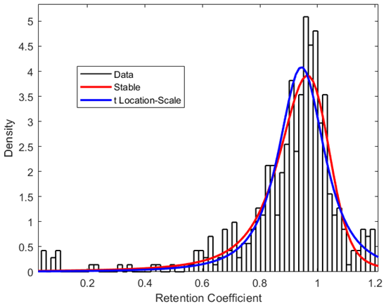 Combining these distributions and filtering out outliers, the dataset is fitted with two distributions to model the dataset: Stable and t Location-Scale. The parameters for these fits can be found in Tables S1 and S2 in the Supplement. These distributions are functional estimations of the statistical density of retention coefficients based on the empirical measurements in this experiment. The Stable Distribution appears to model the data most accurately as the parameter errors are lower than the t Location-Scale Distribution, and the data points in Fig. 4 lie closer to the Stable Distribution curve.