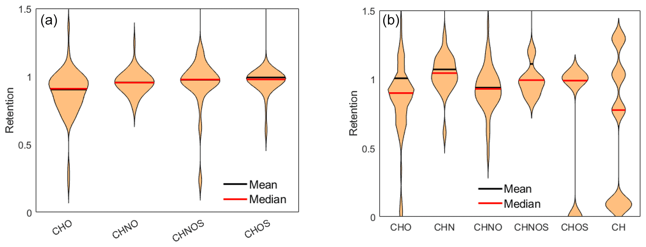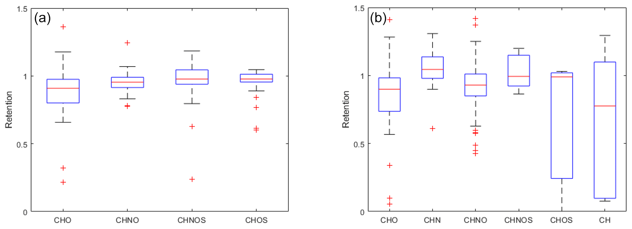 Concerning heteroatoms, the distributions and ranges of retentions are quite similar among all groups. Oxygen-containing species appear to have a slightly wider distribution, which is mostly weighted by the CHO class. Nitrogen-containing species have a smaller standard deviation than the O- or S-containing species, indicating fewer species with variable retentions and more fully retained compounds. This further suggests that nitrogen inclusion enhances retention (see also Fig. S1).