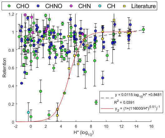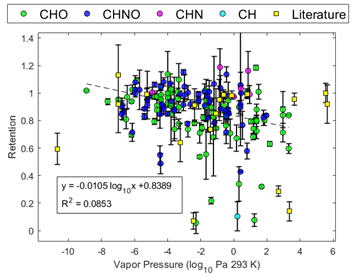 Figure 8Retention coefficient as a function of estimated vapor pressure. Color denotes the compositional class of the assigned compound: green for CHO, blue for CHNO, magenta for CHN, cyan for CH, and yellow squares for values taken from the literature. Dashed line shows linear fit.