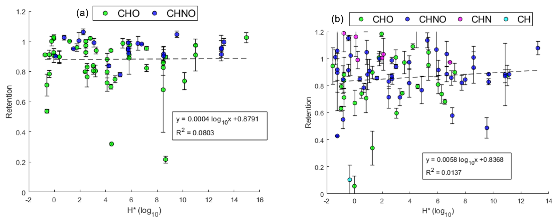 Figure 9Effective Henry's law constant H* versus retention coefficient. (a) (−)HESI. (b) (+)HESI. Color denotes the compositional class of the assigned compound: green for CHO, blue for CHNO, magenta for CHN, and cyan for CH. Dashed line shows linear fit.