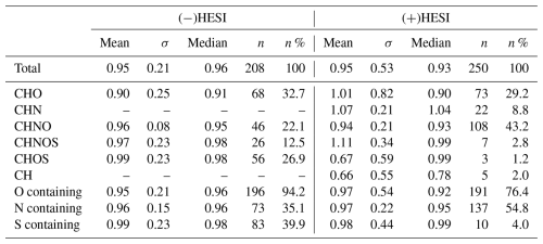 In the positive mode, 342 significant, non-background-detected compounds were found from over 1800 features. A total of 250 met the peak quality constraints and were then used for analysis. A total of 218 of those compounds (87 %) had successfully assigned compositions, and 84 were then selected for additional property calculations. Comparatively fewer compounds were assigned compositions in the positive mode as phosphorous-containing species were not considered. Phosphorous-containing species can represent almost one-third of positively ionizable species in rainwater WSOCs (Seymore et al., 2023), and so these species are likely to make up a significant portion of species variety that is not considered.