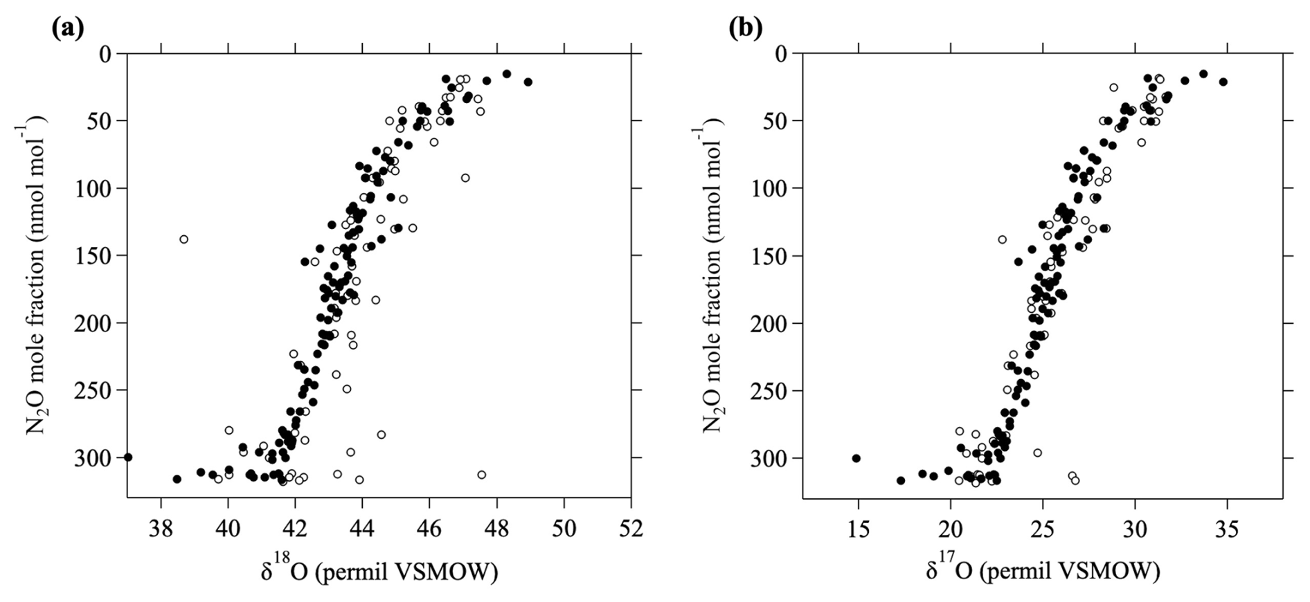 Figure 1The relationship between the N2O mole fraction and (a) δ18O in CO2 and (b) δ17O in CO2. δ18O and δ17O values measured by Kawagucci et al. (2008) are shown by open circles. δ18O and δ17O values calculated assuming an MIE factor of 1.7 (see text) in this study are shown by closed circles.