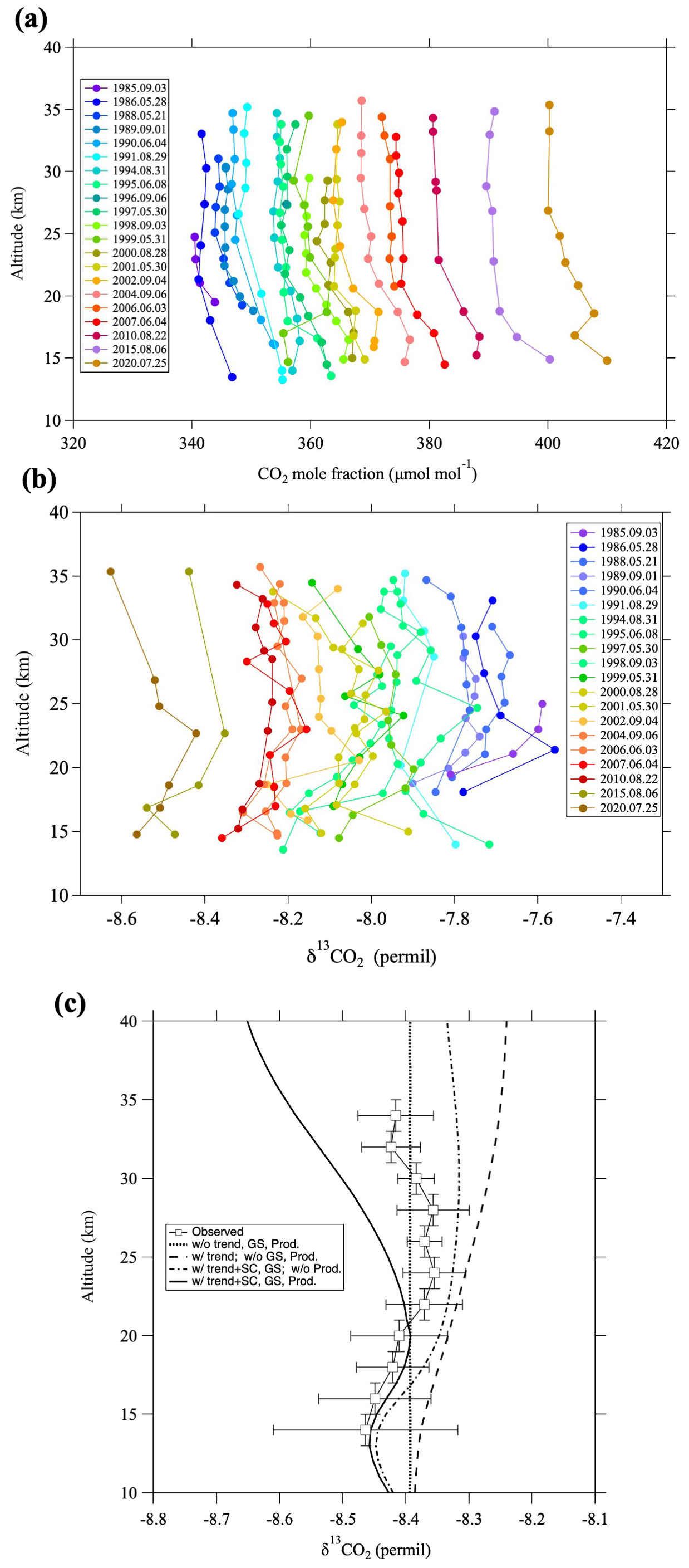 Figure 2Vertical profiles of (a) CO2 mole fraction and (b) δ13CO2 over Japan during the period 1985–2020. (c) δ13CO2 values averaged over the study period and grouped in 11 2 km vertical bins (open squares). Curves show 2-D modeling results without the tropospheric trend, seasonal cycle, gravitational separation (GS), or airborne sources (thick dotted line), including only the tropospheric trend (dashed line), including the tropospheric trend, seasonal cycle, and GS (dotted-dashed line), and including the tropospheric trend, seasonal cycle, GS, and airborne sources (solid line).