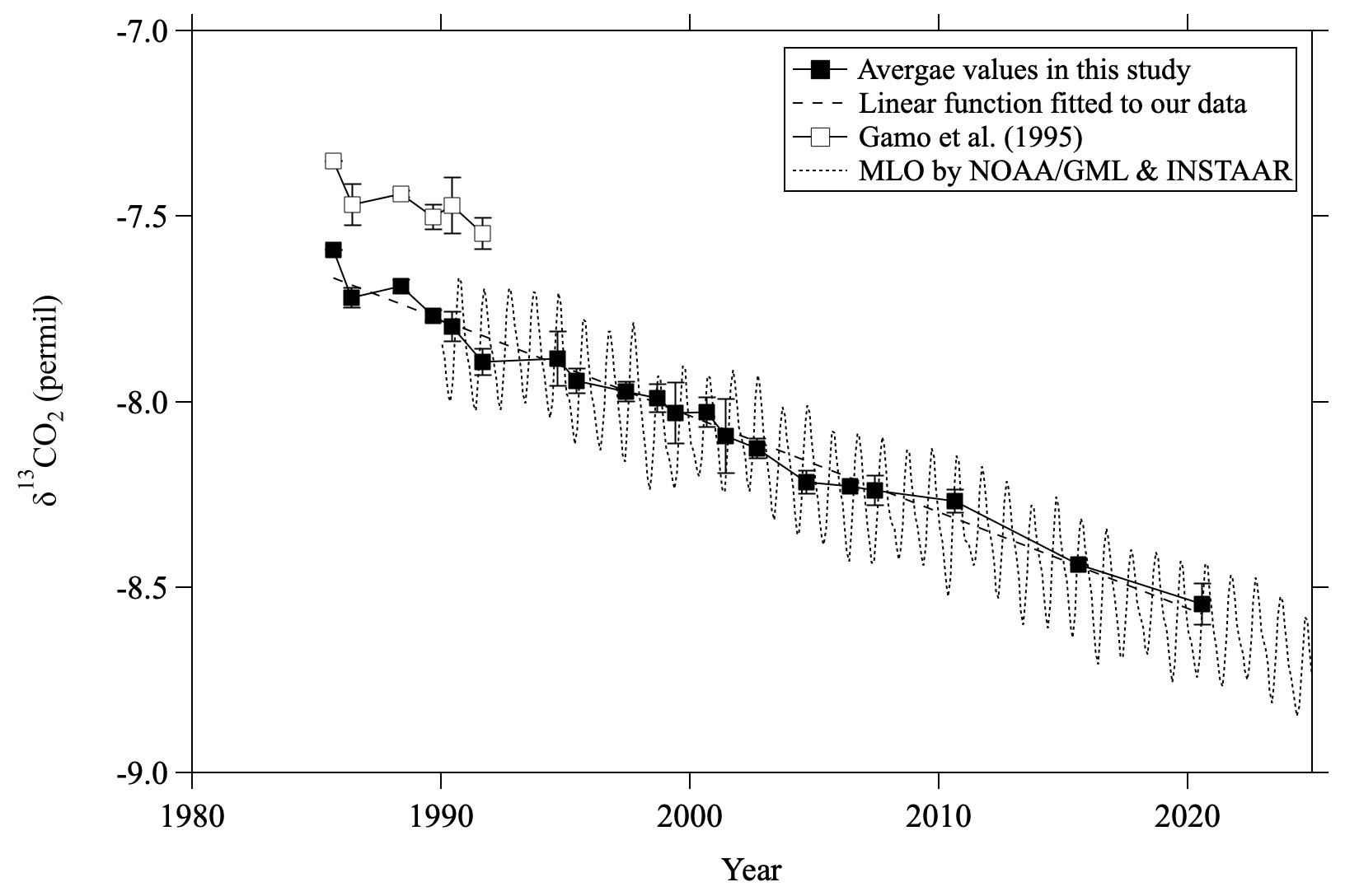 Figure 3Average mid-stratospheric (>24 km altitude) δ13CO2 values over Japan (closed squares). The linear function fitted to the average values using the least-squares method is shown by the dashed line. Values reported by Gamo et al. (1995) are shown by open squares. Monthly average δ13CO2 observed at Mauna Loa by NOAA/GML and INSTAAR (Michel et al., 2025) is also shown by the dotted line.
