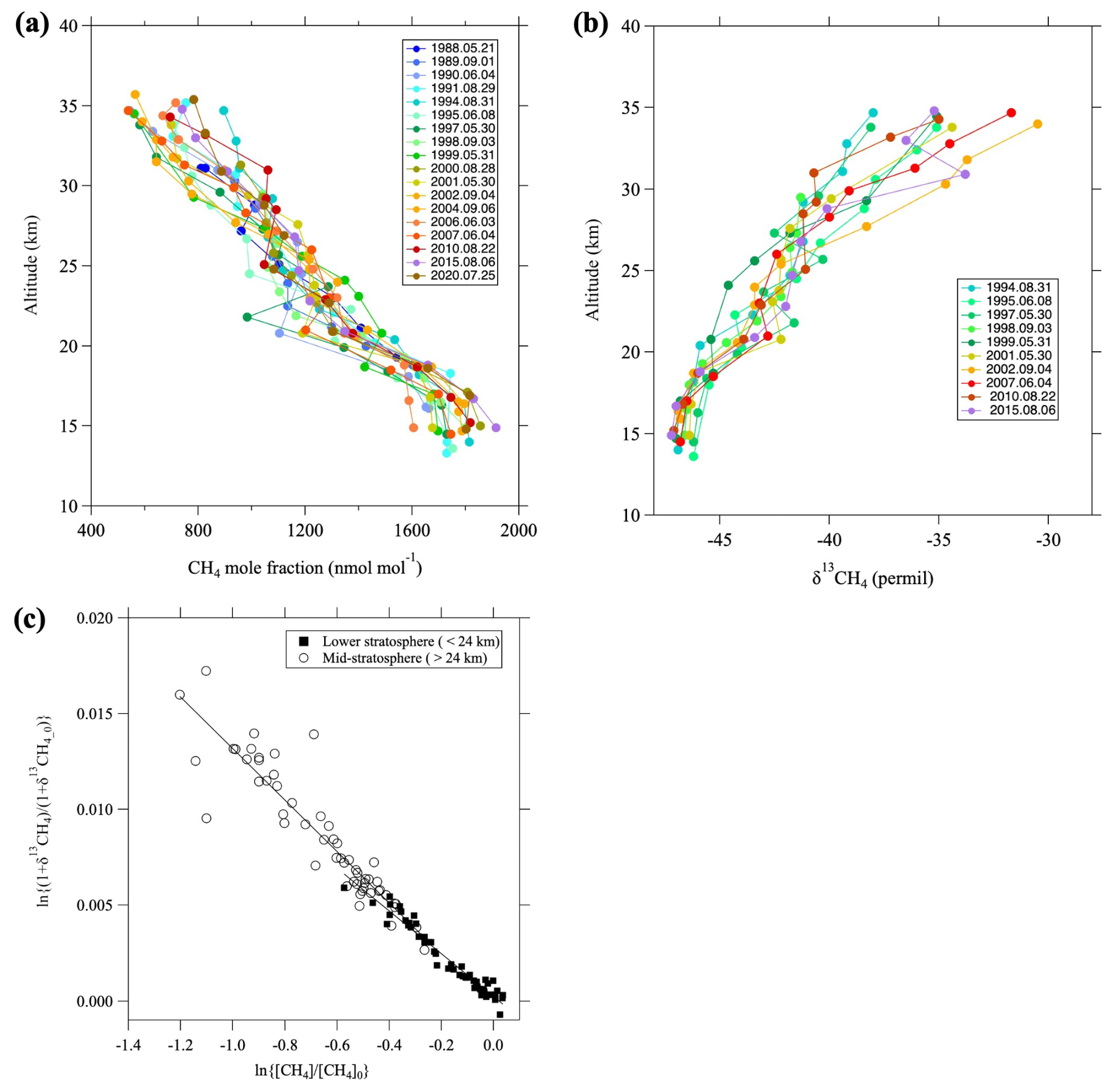 Figure 4Vertical profiles of (a) CH4 mole fraction and (b) δ13CH4 over Japan, and (c) the relationship between ln{(δ13CH4+1)/(δ13CH4_0+1)} and ln([CH4] / [CH4]0). In (c), the data are divided into the lower (<24 km, closed squares) and mid-stratosphere (>24 km, open circles), and the linear functions fitted to each dataset using the least-squares method are shown by lines.