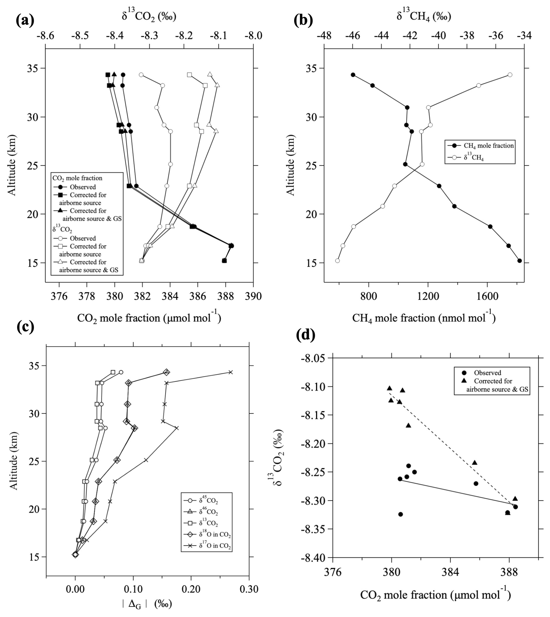 Figure 5(a) Vertical profiles of the CO2 mole fraction (closed circles) and δ13CO2 (open circles) observed over Japan on 22 August 2010. Values corrected for airborne CO2 sources (squares) and additionally for gravitational separation (GS; triangles) are also shown. (b) Vertical profiles of the CH4 mole fraction (closed circles) and δ13CH4 (open circles). (c) Vertical profiles of the magnitude of GS corrections, |ΔG|, for δ45CO2 (circles), δ46CO2 (triangles), δ13CO2 (squares), δ18O (diamonds), and δ17O (crosses) in CO2. (d) Observed δ13CO2 plotted against CO2 mole fraction (closed circles) and those corrected for airborne CO2 sources and GS (triangles). Lines are linear functions fitted to each trend by the least-squares method.