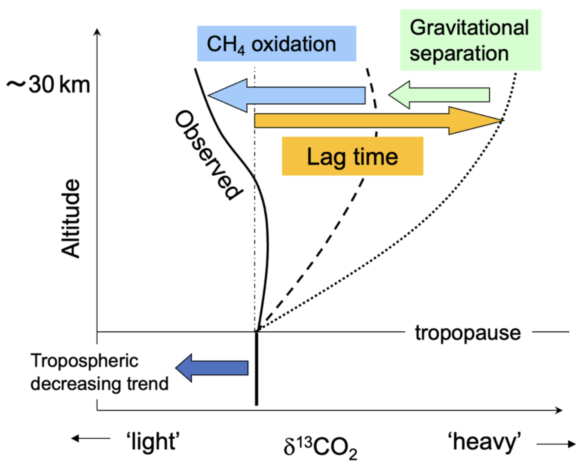 Figure 6Schematic representation of the mechanisms influencing the vertical profile of stratospheric δ13CO2 (see text).