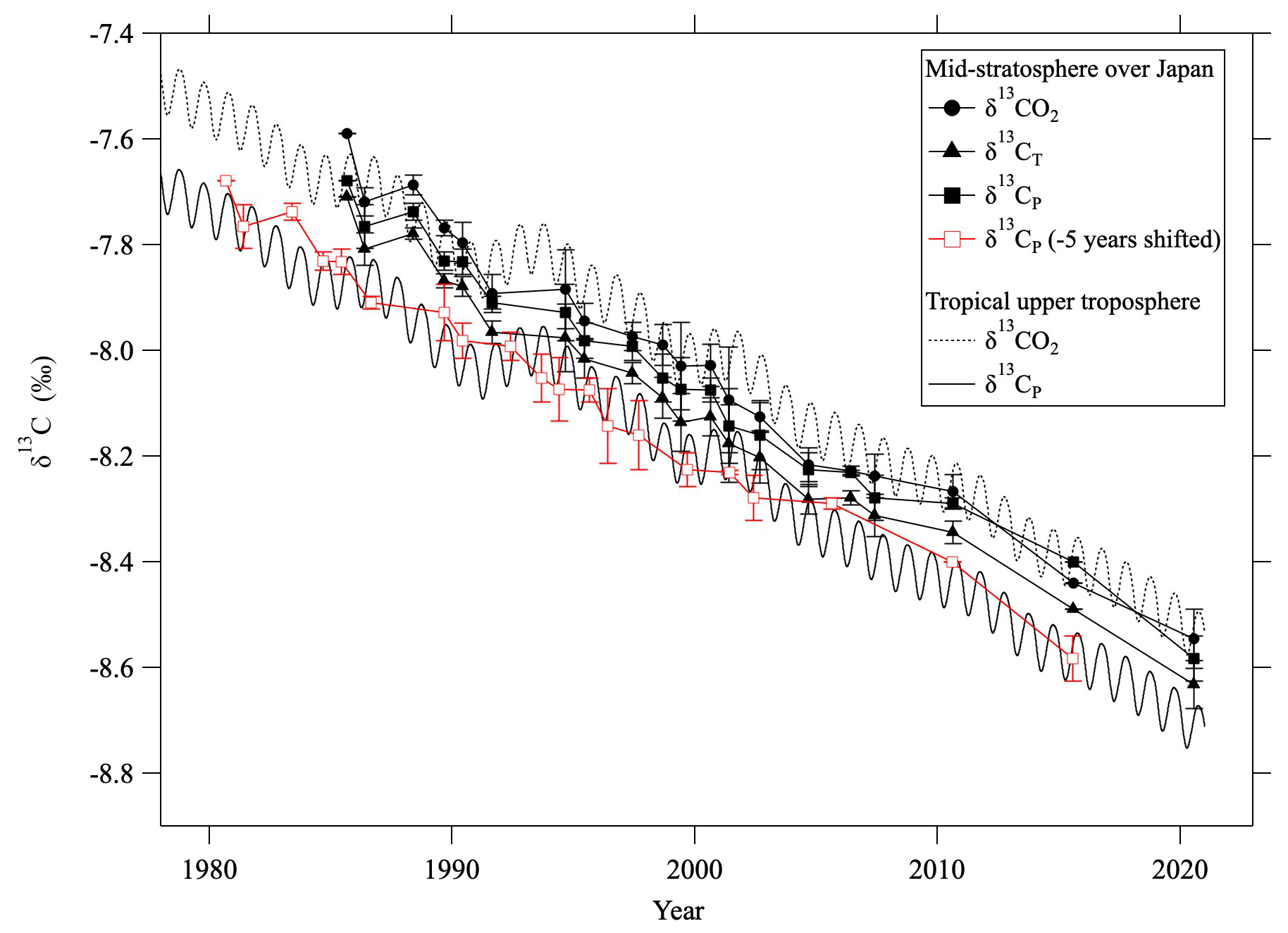 Figure 9Average mid-stratospheric (>24 km altitude) values of δ13CO2 (closed circles), δ13CT (closed triangles), and δ13CP (closed squares) over Japan. δ13CO2 and δ13CP in the tropical upper troposphere are shown by dashed and solid lines, respectively. Red squares show the mid-stratospheric δ13CP shifted by 5.0 yr.