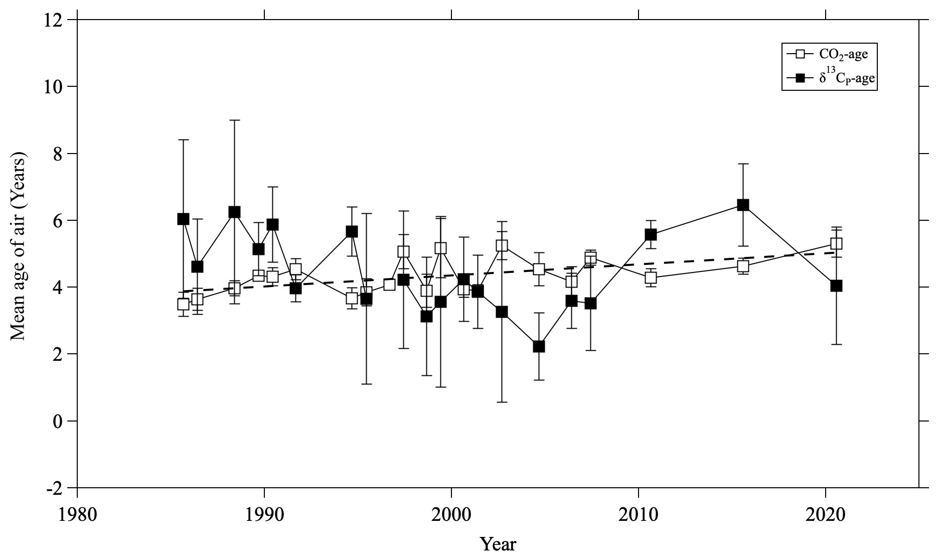 It is thus possible to estimate the mean age of air using δ13CP, which can serve as an additional air age tracer. Therefore, we estimated the mean age of air not only from the CO2 mole fraction but also from δ13CP using a convolution method. Details of the age estimation method are described in Appendix C. The total uncertainty on individual δ13CP ages was estimated to be ± 1.9 yr. This rather large uncertainty means that δ13CP, with its smaller tropospheric secular change compared to other age tracers, was somewhat disadvantageous for age estimations. Because some of the δ13CP values in the lower stratosphere showed high variability, with values lower than the tropospheric reference record, the convolution method could not provide reasonable age estimations for those data. We attributed these irregularities and low values to the large seasonal variations in the upper troposphere and the stratosphere–troposphere air exchange in the lower stratosphere. Therefore, only mid-stratospheric (>24 km altitude) data were taken into account for age estimations, and the average values of the mean age were calculated.