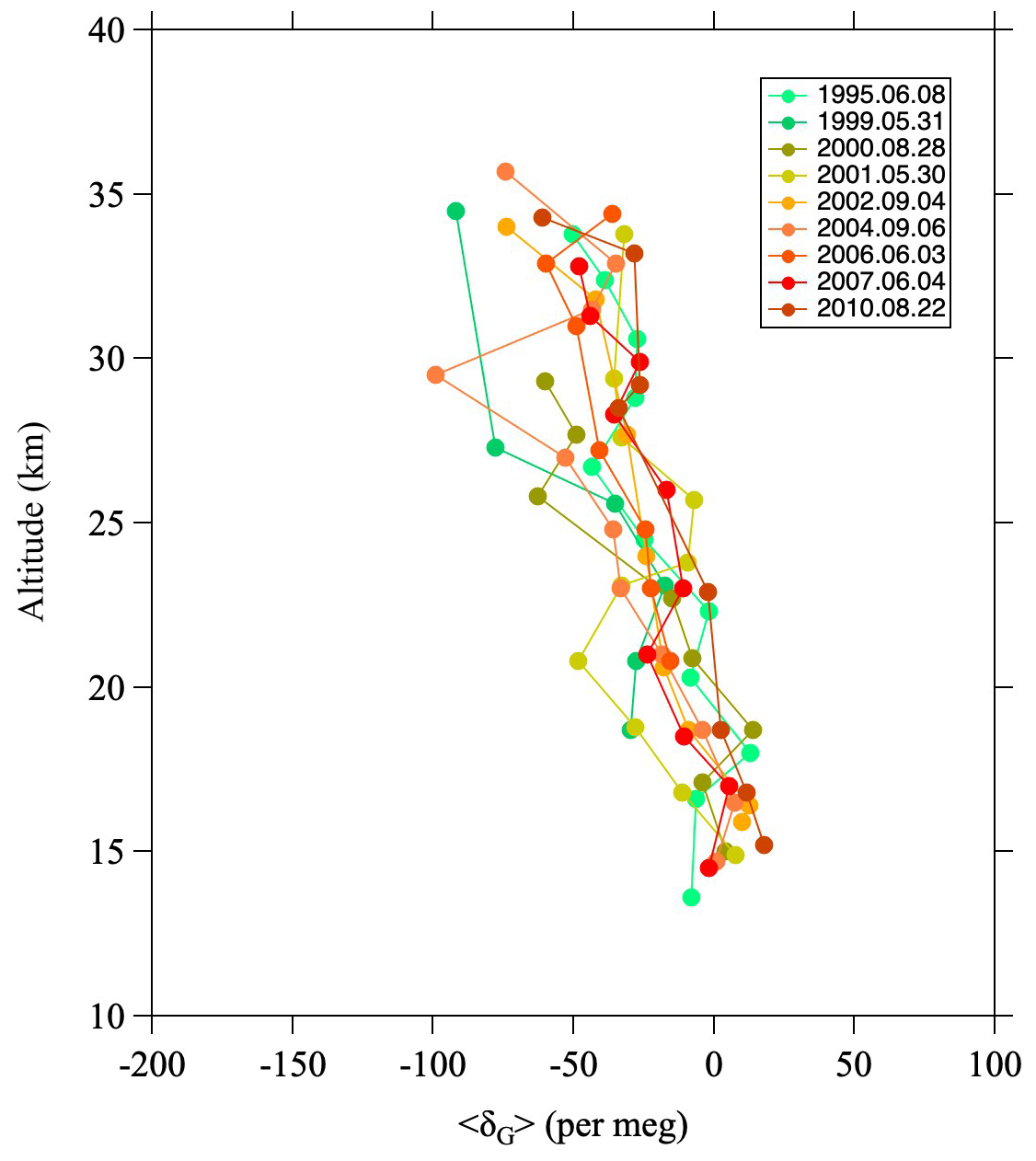 Below an altitude of  17 km, δ13CO2 values are quite variable, often being irregularly high or low depending on the observation year, which is exhibited by the large error bars in Fig. 2c. Based on detailed aircraft observations of δ13CO2 variations in the troposphere over Japan, Nakazawa et al. (1993) reported that the seasonal cycle of δ13CO2 between 8 km altitude and the tropopause show a minimum around May and a maximum around September, with a peak-to-peak amplitude of 0.36 ‰. Indeed, our balloon observations were conducted in either spring (late May to early June) or summer (late July to early September), and the observed δ13CO2 values at lower altitudes tended to be lower in spring and higher in summer. Accordingly, we attribute the large δ13CO2 variations below an altitude of 17 km to the upper tropospheric air itself, or stratospheric air directly influenced by the troposphere.
