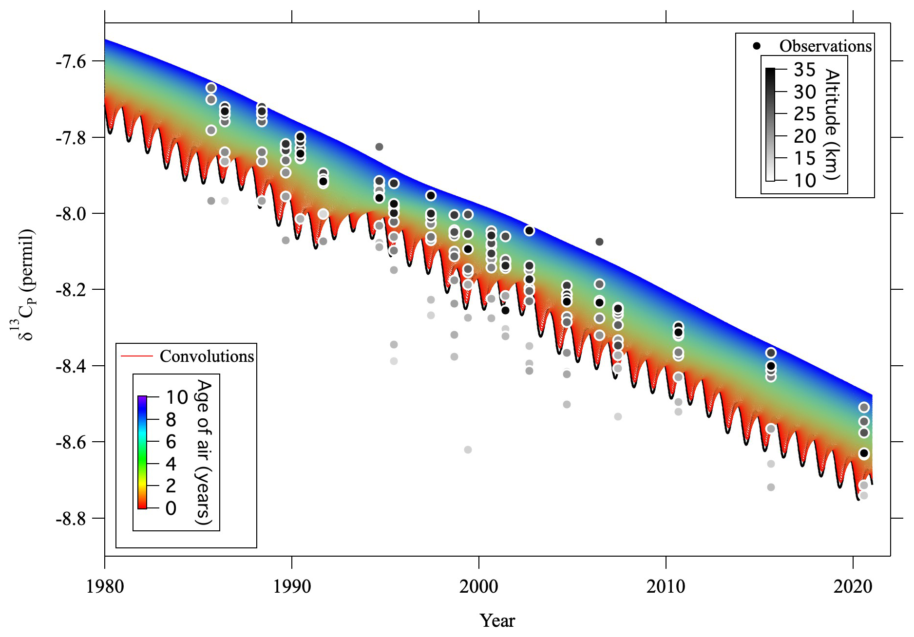As seen in Fig. 9, δ13CO2 values did not differ significantly between the troposphere and the mid-stratosphere. However, the δ13CP values calculated from observed values in the mid-stratosphere were, on average, about 0.14 ± 0.03 ‰ higher than those calculated for the tropical troposphere. This means that δ13CP is conservative in the stratosphere and that the decreasing tropospheric δ13CP trend through time propagates into the stratosphere with a time delay. Roughly calculated, this lag time is about 5 yr, consistent with the age of air estimated from CO2 mole fractions (Appendix C) and the model calculation. If the mid-stratospheric δ13CP values were shifted by 5 yr, they were in good agreement with the tropospheric δ13CP trend (Fig. 9).