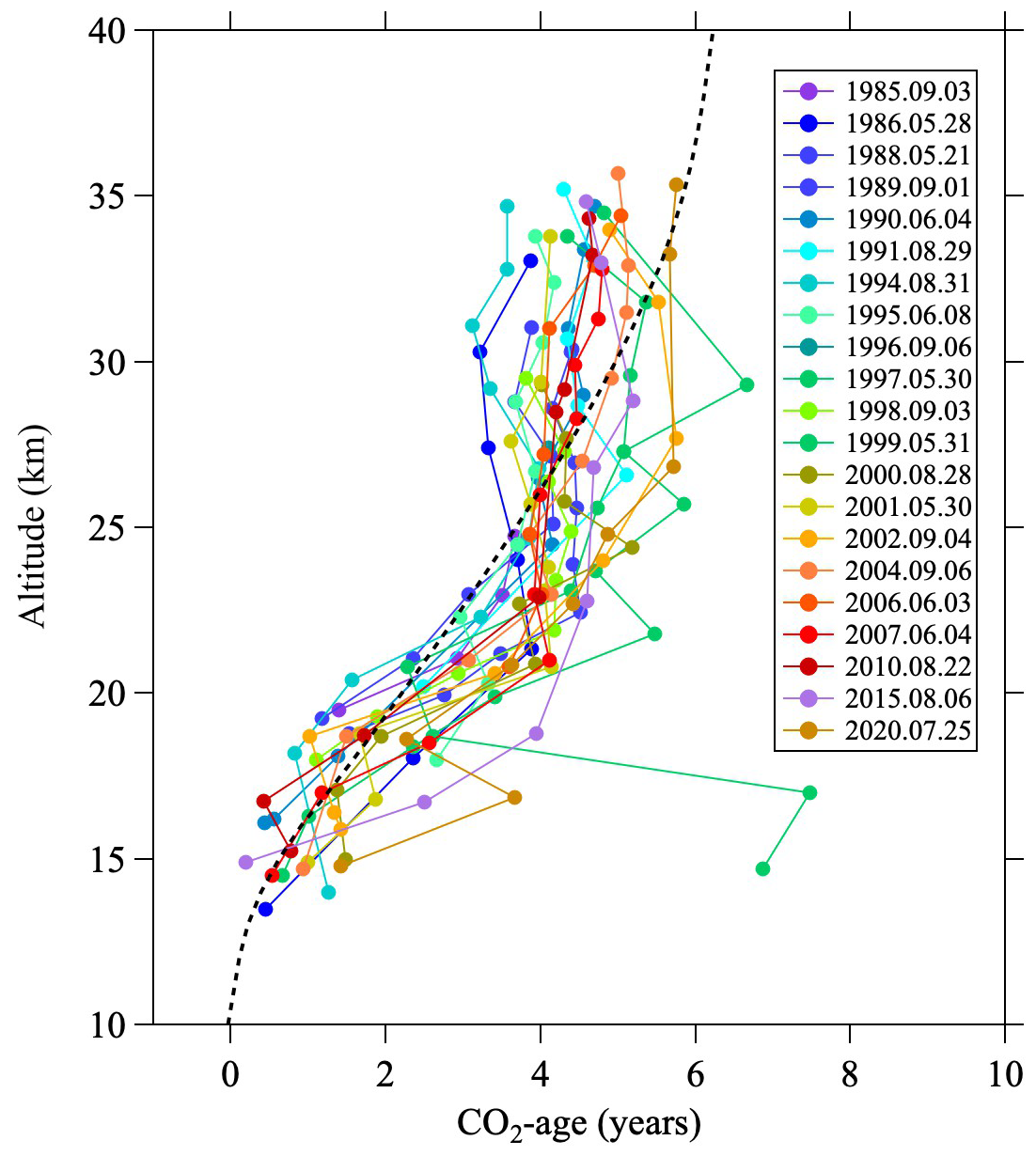 The age of stratospheric air is the transit time of air from around the tropical tropopause to a certain location in the stratosphere, which is a powerful tool for diagnosing stratospheric transport (see Garny et al., 2024 for a review of the latest developments in air age studies). It is expected that possible changes to the Brewer–Dobson circulation induced by climate change are detectable as long-term changes in the mean age of air. For this purpose, age tracers, such as mole fractions of CO2 and SF6, have been measured in air samples collected by scientific balloons and satellites (e.g., Engel et al., 2009, 2017; Stiller et al., 2012). CO2 mole fractions observed in the mid-stratosphere over Japan have been combined with SF6 data to provide the longest record of the mean age of air, as reported by Engel et al. (2009, 2017) and Ray et al. (2014). Engel et al. (2017) reported that the mean age of air in the mid-stratosphere does not indicate a significant trend over the period 1975–2016, with only a slightly positive increase of +0.15 ± 0.18 yr decade−1. However, recent models predict accelerating circulation throughout the stratosphere (e.g., Butchart, 2014), which will decrease the mean age of air. Such a decreasing trend is consistent with observational results in the lower stratosphere (Ray et al., 2014). Despite many efforts to elucidate the trend of age of air, a discrepancy remains between mid-stratosphere age trends in models and observations. One reason for this discrepancy is the large uncertainties on the observational trends. To resolve this problem, it is necessary to increase the frequency of high-altitude balloon observations and observe additional age tracers beyond CO2 and SF6. Perfluorocarbons and hydrofluorocarbons with extremely long lifetimes could be alternative age tracers (Leedham Elvidge et al., 2018; Laube et al., 2025; Umezawa et al., 2025), and observations of such multiple age tracers should reduce the uncertainties on mean age of air estimates.
