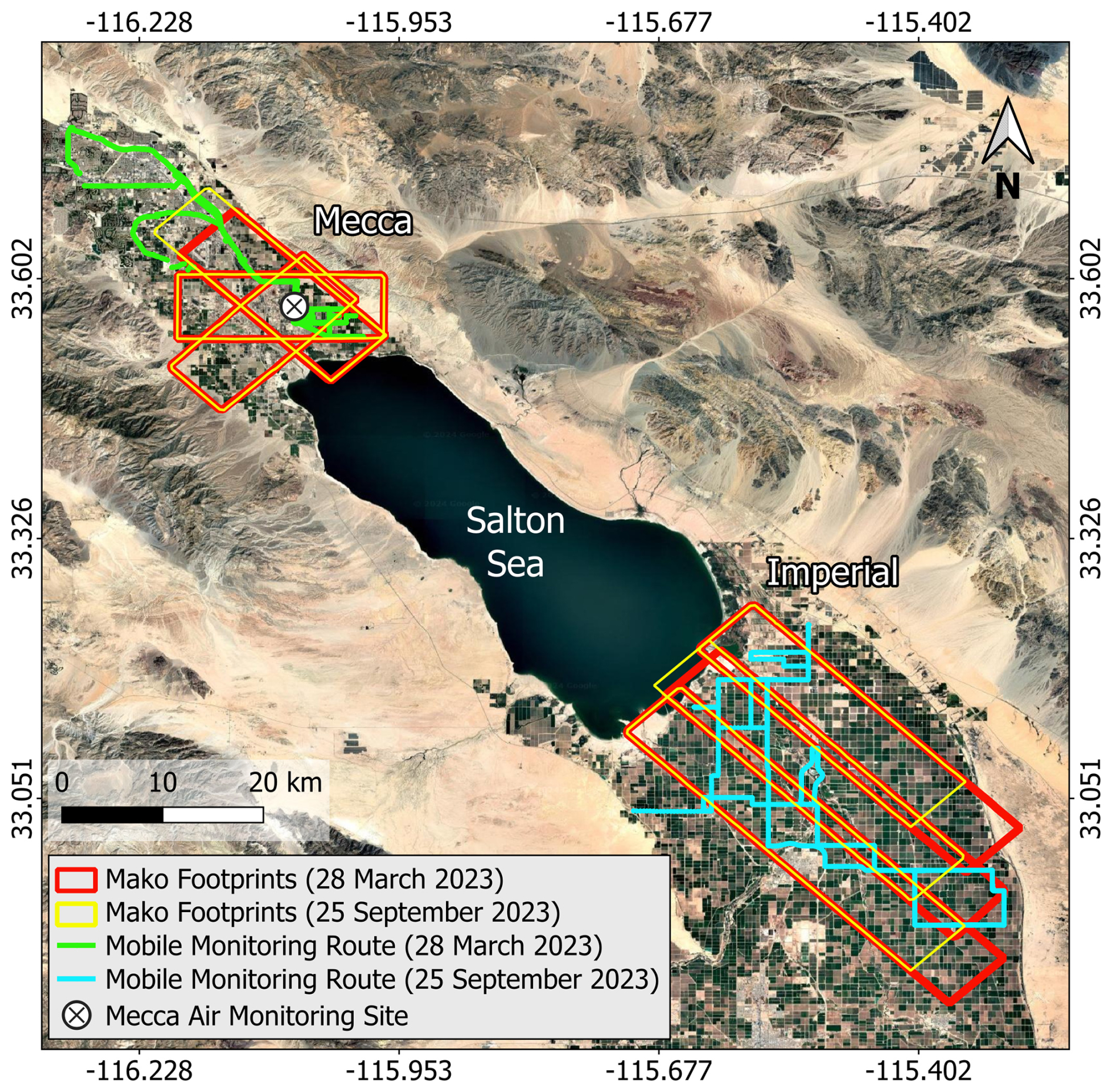 The study focused on the Salton Sea region in southern California, selected for its diverse and significant NH3 emission sources and unique environmental characteristics. Measurements included airborne remote sensing and ground-based in situ monitoring, both mobile and stationary. Figure 1 illustrates the study areas, the footprints of airborne remote sensing measurements, the routes covered by the mobile platform, and the location of the air monitoring site utilized in this research. The following sections detail each component of the study.