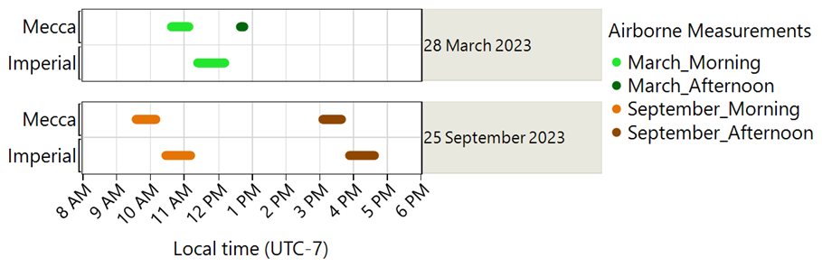 Figure 2Timing of airborne measurements over the Mecca and Imperial study areas on 28 March and 25 September 2023. The time periods defined in the legend are used throughout the paper to distinguish measurement sessions.