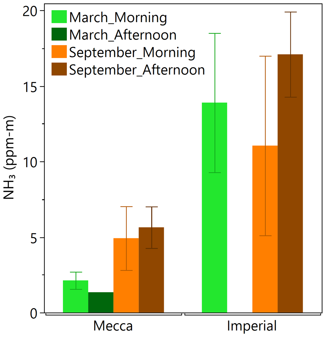 Pronounced variations in NH3 levels were observed over space and time within the study areas, and the tri-platform approach provided complementary perspectives in capturing these spatiotemporal trends. Average NH3 levels measured by the airborne platform were found to be over 8 times higher in Imperial compared to Mecca during the March campaign and approximately 2.5 times higher during the September campaign. Similarly, mobile monitoring revealed nearly 10 times higher average NH3 levels in Imperial compared to Mecca. Directional analysis at the Mecca AMS indicated that emissions from Imperial likely contribute to elevated NH3 levels in Mecca. Seasonally, the average NH3 column densities over Mecca were approximately 3.5 times higher in September than in March, while average levels in Imperial remained comparable across both seasons. The seasonal trend observed by the airborne imaging instrument in Mecca aligns closely with stationary measurements from the Mecca AMS, which recorded NH3 levels over 2.5 times higher in September compared to April (used as a proxy for March, as the NH3 monitor was non-operational).