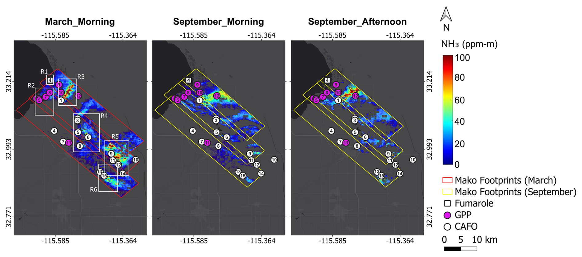 During the September campaign, an additional series of airborne measurements in multi-scan (movie) mode was conducted over nine pre-determined sources, including GPPs, fumaroles, CAFOs, and a waste recycling facility. These measurements, collected at a nominal frame rate of 0.6 Hz during both morning and afternoon flight sessions, captured short-term temporal variations in NH3 emissions from these sources. The data will be used to estimate emission fluxes from these sources, which will be the subject of a separate publication from this study.
