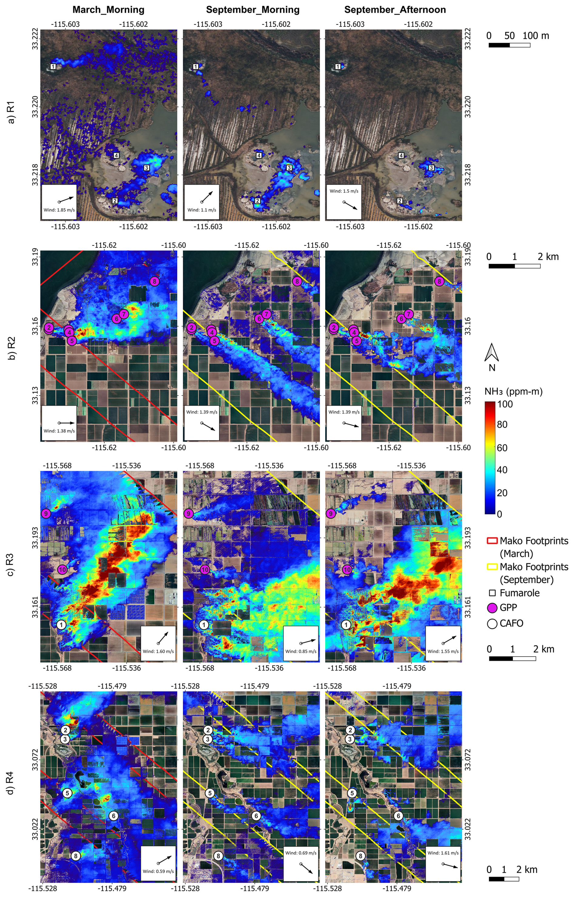 The measurements presented here reinforce and expand understanding from previous research on atmospheric ammonia using airborne, satellite, and modeling approaches. For example, Kuai et al. (2019) utilized airborne HyTES measurements with 2 m spatial resolution in the California San Joaquin Valley to detect NH3 enhancements from cattle feedlots, power plants, and smoldering fires, reporting concentrations up to 5 times higher over feedlots compared to power plants – findings that closely align with the plume magnitudes and spatial variability observed in this study. Wang et al. (2021) oversampled IASI satellite data over the contiguous US (CONUS) from 2008–2017 to produce ∼2 km resolution monthly NH3 maps, consistently identifying the Imperial Valley as a hotspot with higher levels in September compared to March, consistent with our findings. Similarly, Pleim et al. (2019) employed the CMAQ model coupled with the EPIC agricultural model over CONUS to simulate bidirectional ammonia fluxes, highlighting the significant influence of agricultural fertilizer and livestock emissions in California's Central and Imperial Valleys.
