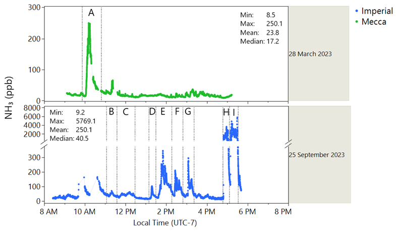Continuous 1 min NH3 monitoring was conducted using a Picarro G2301 analyzer at the South Coast Air Quality Management District (South Coast AQMD) Mecca air monitoring site (AMS) (Fig. 1). Routine quality assurance procedures, including monthly zero and span checks, were conducted by South Coast AQMD. Unfortunately, the instrument was non-operational for the entire month of March 2023, concurrent with the first day of airborne measurements. However, it was operational before and after March 2023, allowing the assessment of NH3 levels on the second airborne measurement day in September and evaluation of its temporal trends throughout 2023.