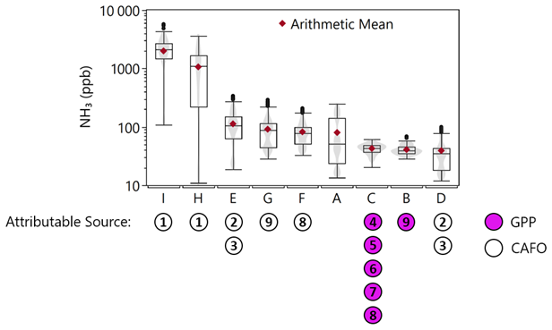 Figure 10Box plots of ground-level NH3 concentrations (ppb) for individual plumes (A to I), as defined in Fig. 8, measured by the mobile platform, along with the potential attributable sources. Boxes represent the interquartile range (IQR), with the horizontal line inside each box indicating the median value. Whiskers extend to 1.5 times the IQR, and outliers are values exceeding 1.5 times the IQR. Arithmetic mean values are shown as red diamonds.