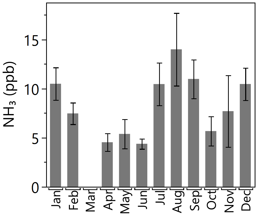 Figure 11Monthly averaged ground-level NH3 concentrations (ppb) measured at the Mecca air monitoring site in 2023. Error bars represent confidence intervals. March data are missing due to the NH3 monitor being non-operational during that period.