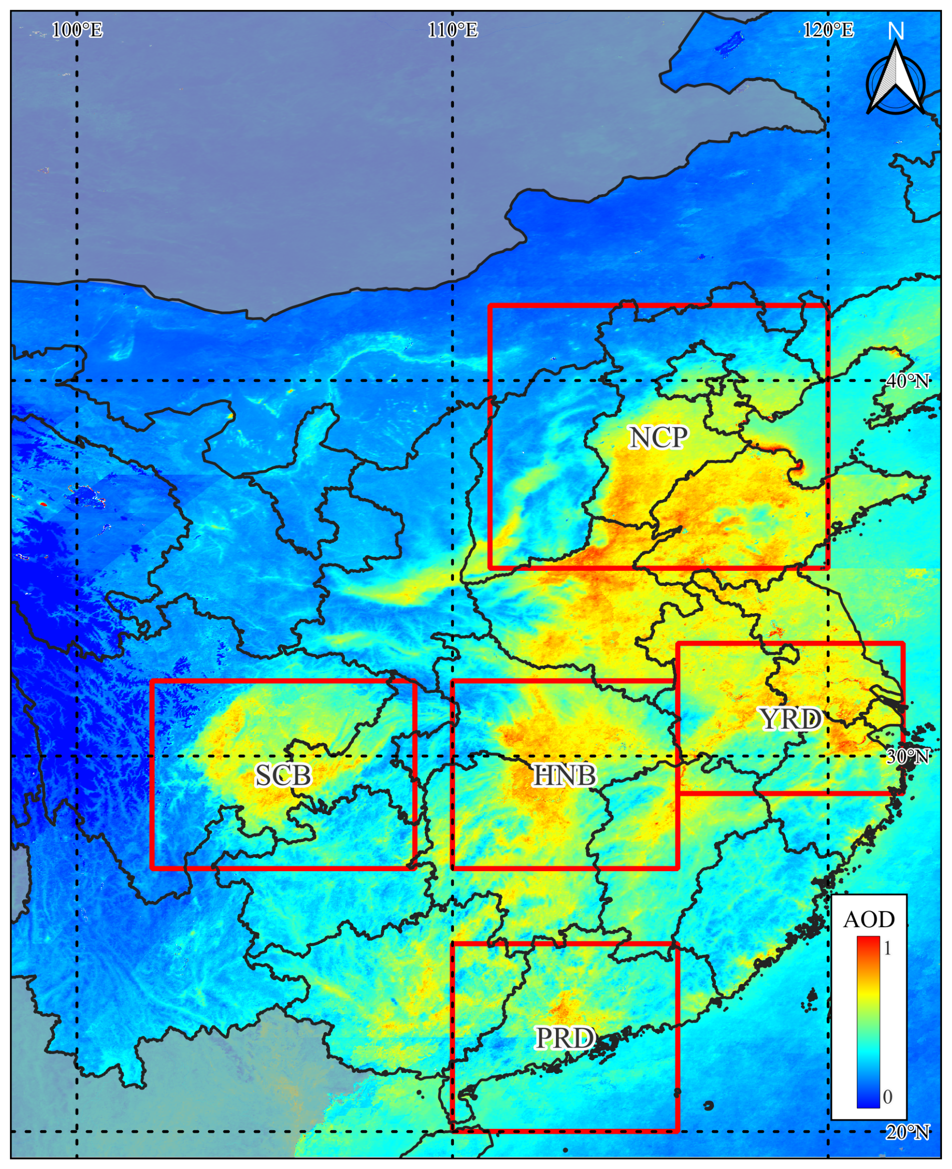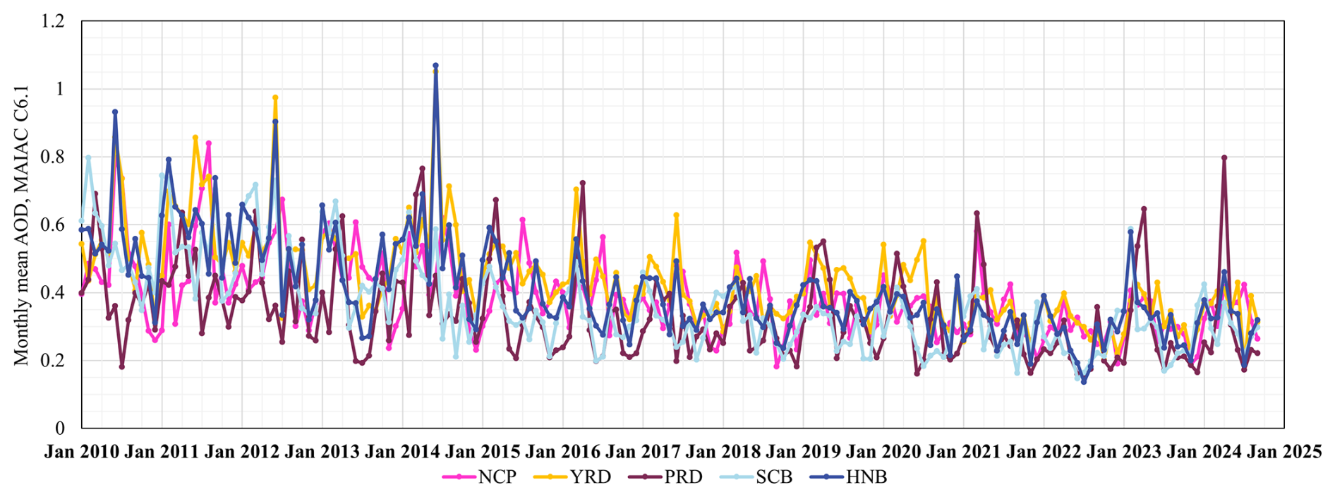 Satellite-derived monthly mean time series of AOD over five representative regions in China were presented for the period from January 2010 to September 2024. AOD variations, both temporal variations within a region and differences between the five regions, were discussed, and contributions from anthropogenic and meteorological factors were analyzed based on comparison with model simulations.